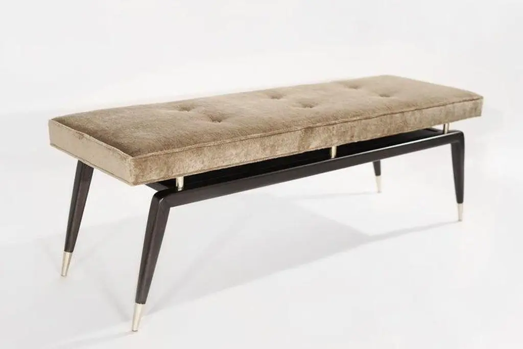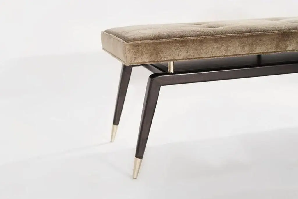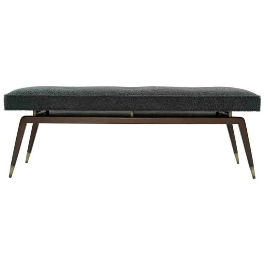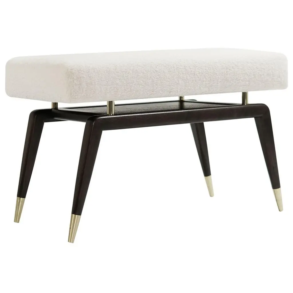 The Gio Bench by Stamford Modern: a perfect blend of Gio Ponti's timeless design and modern functionality. This elegant bench features signature angled legs with metal sabots for added stability and longevity. The upholstered cushion, elevated by metal risers, offers both refined elegance and structural integrity.Personalize your bench with custom metal and wood finishes. View all images for finish options.Available COM or COL only (4 yards). Please contact us for custom dimensions to ensure a perfect fit for your space.