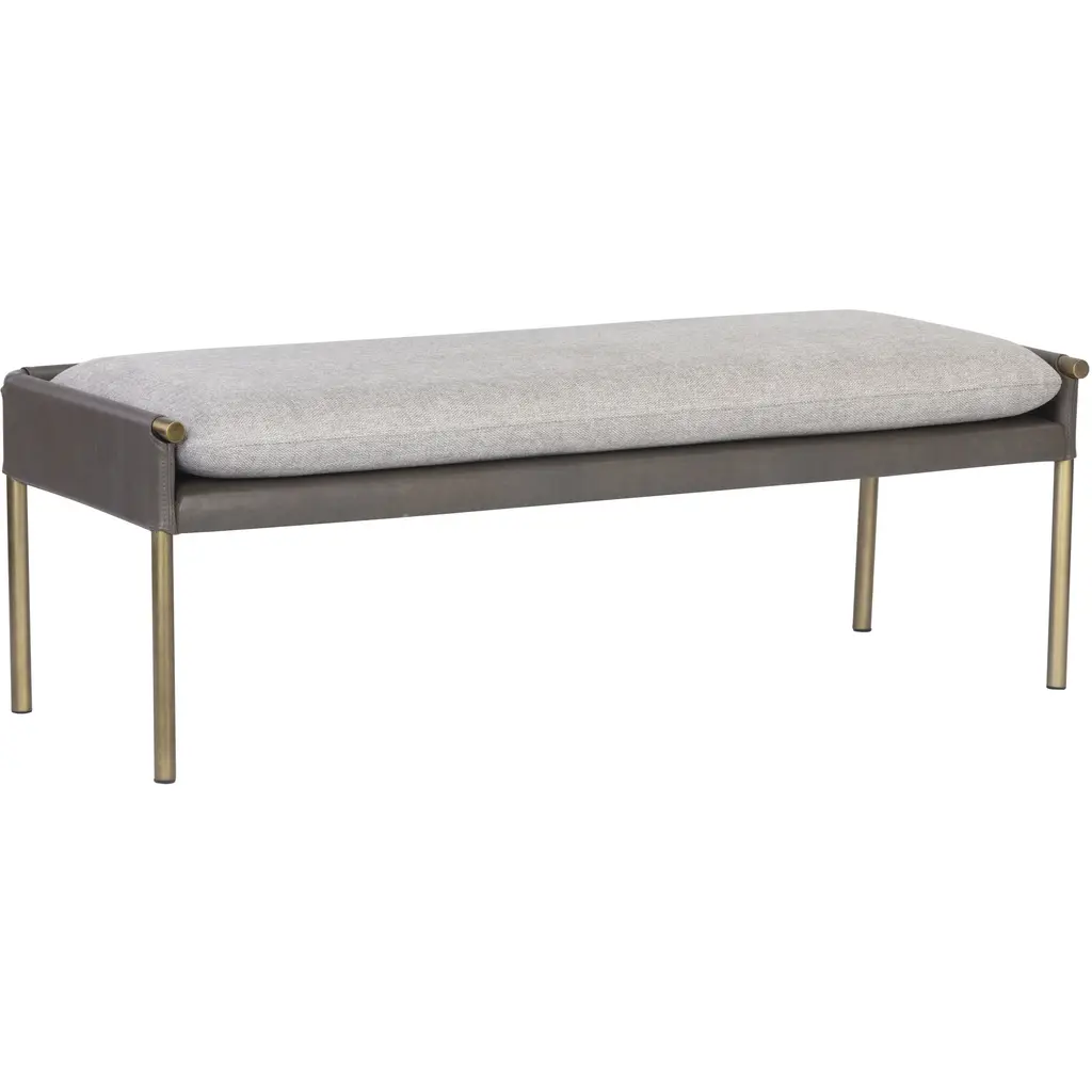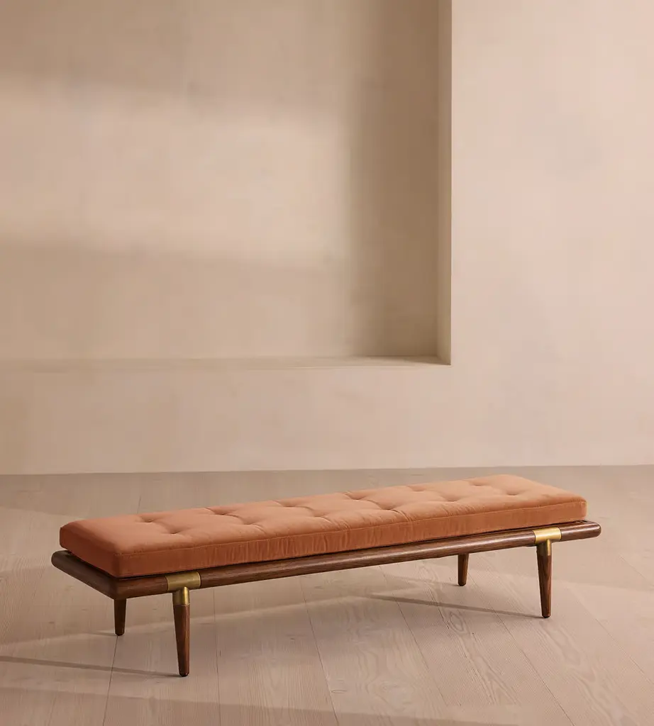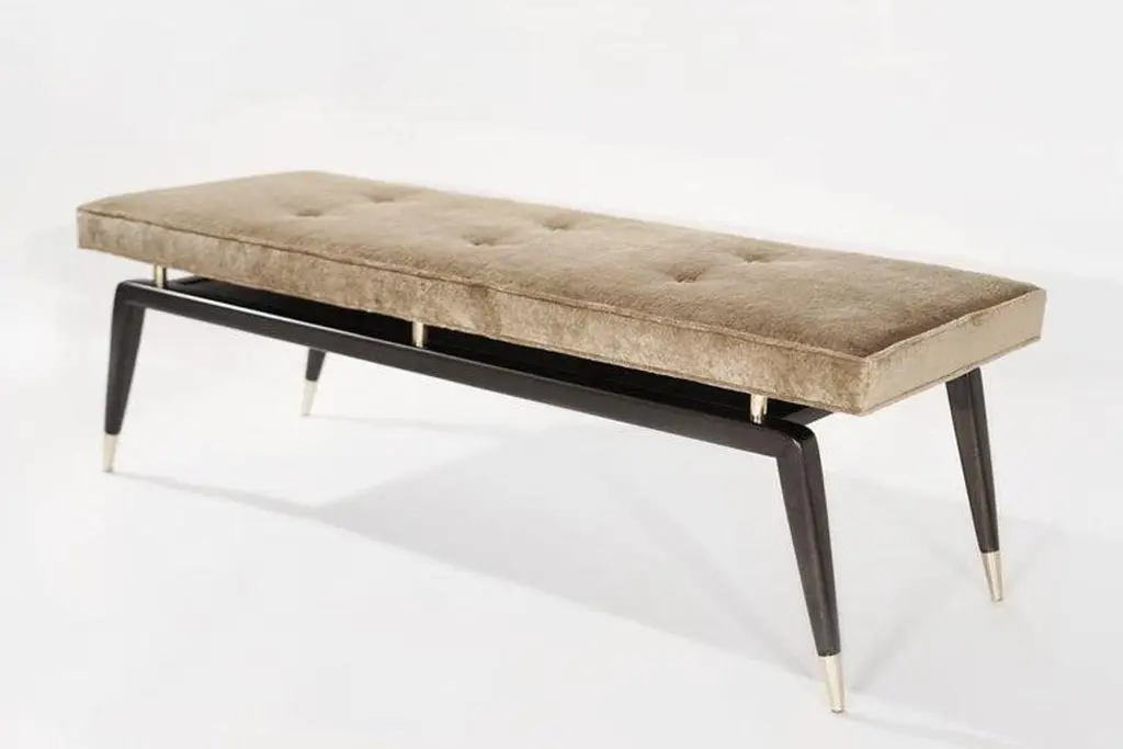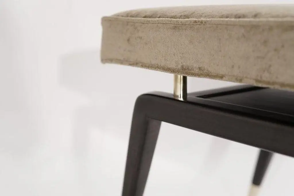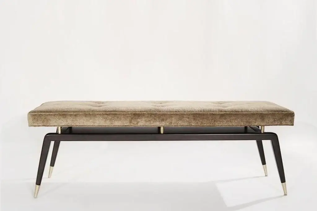 The Gio Bench by Stamford Modern: a perfect blend of Gio Ponti's timeless design and modern functionality. This elegant bench features signature angled legs with metal sabots for added stability and longevity. The upholstered cushion, elevated by metal risers, offers both refined elegance and structural integrity.Personalize your bench with custom metal and wood finishes. View all images for finish options.Available COM or COL only (4 yards). Please contact us for custom dimensions to ensure a perfect fit for your space.