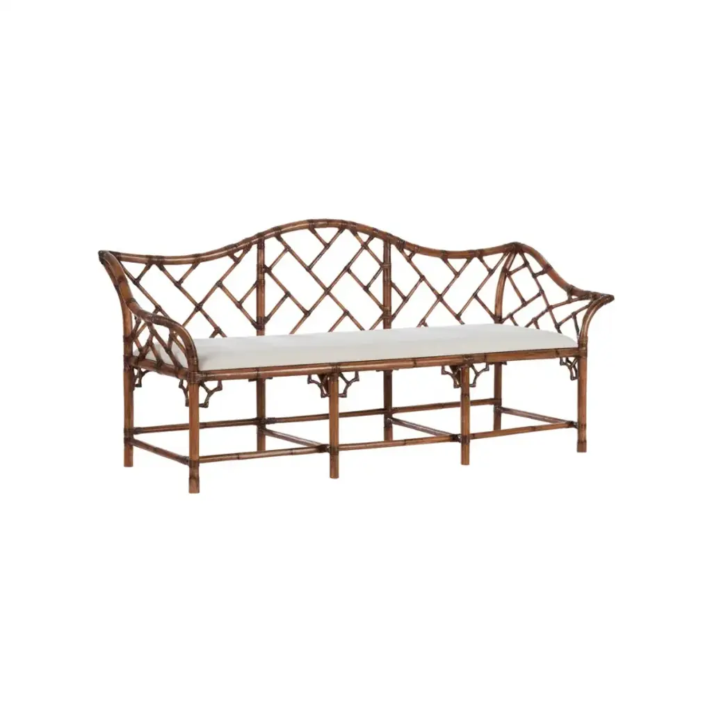 Mottled Brown Rattan Curved Bench With An Upholstered Seat.