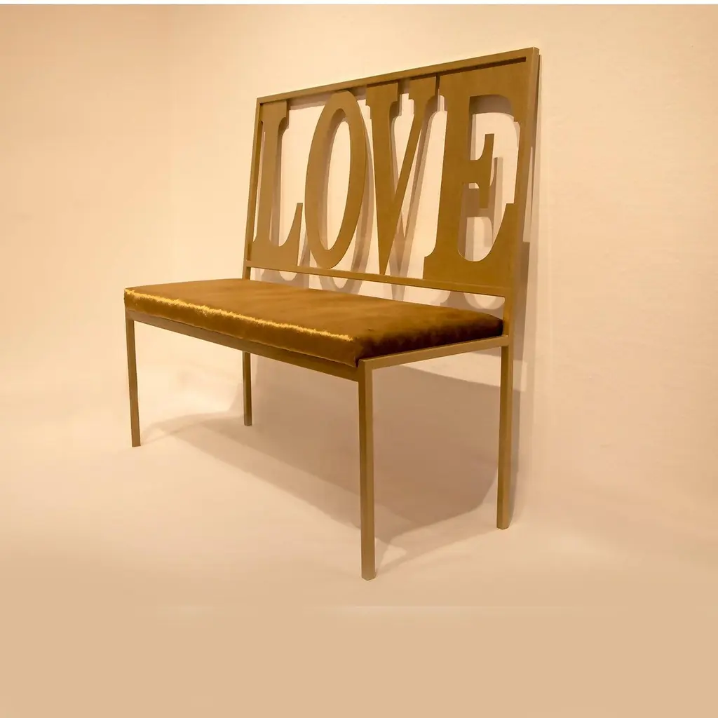 Part of the Imperfect Love Collection inspired by the desire to offer design objects with unique flair, this handcrafted iron bench showcases a warm golden finish and coordinated velvet seat upholstery. Available also in black with black, blue, bronze, or gray velvet upholstery, the slender frame is characterized by an open backrest with four large block letters spelling the word "LOVE". An original piece to complete a contemporary and eclectic interior, this bench adds an element of artful appeal and can be paired with the letter chairs, side tables, and console for a cohesive, playful look.
