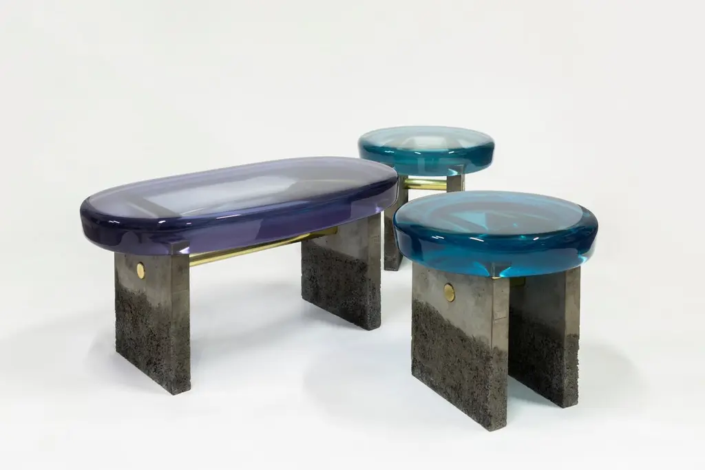Comprising a stylized formal composition, Golia bench presents a thick oval epoxy resin seat supported by two squared concrete legs, held together by a brass bar. The transparent resin reveals the shiny metal links below, creating a multi-level view that lightens the solidity of the base.SIZE: W 96 - D 50 - H 45 cmDraga&Aurel resin colors are absolutely unique as they are handmade using a combination of different shades.