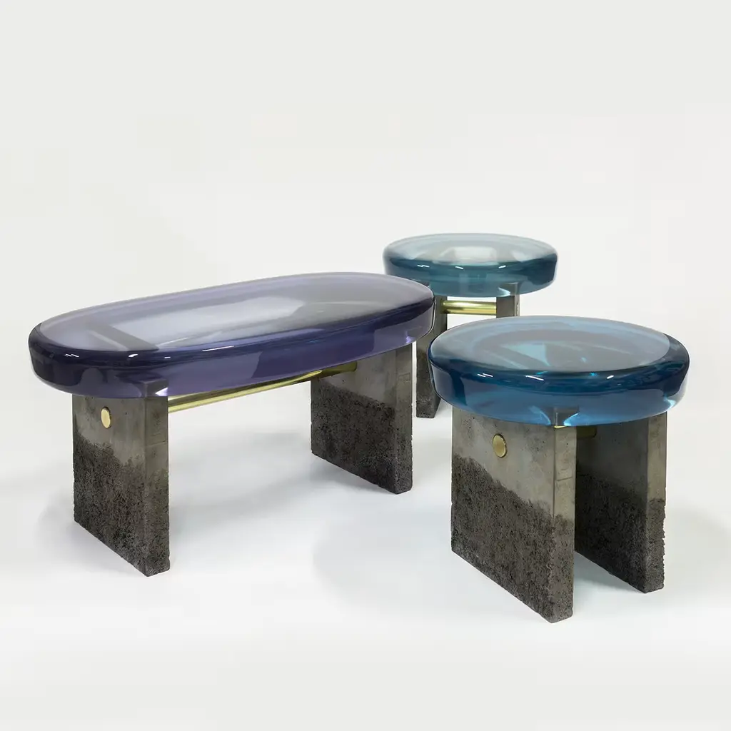 Comprising a stylized formal composition, Golia bench presents a thick oval epoxy resin seat supported by two squared concrete legs, held together by a brass bar. The transparent resin reveals the shiny metal links below, creating a multi-level view that lightens the solidity of the base. Available in different colors.