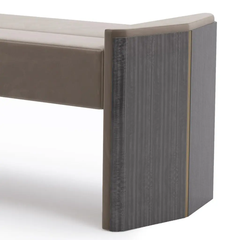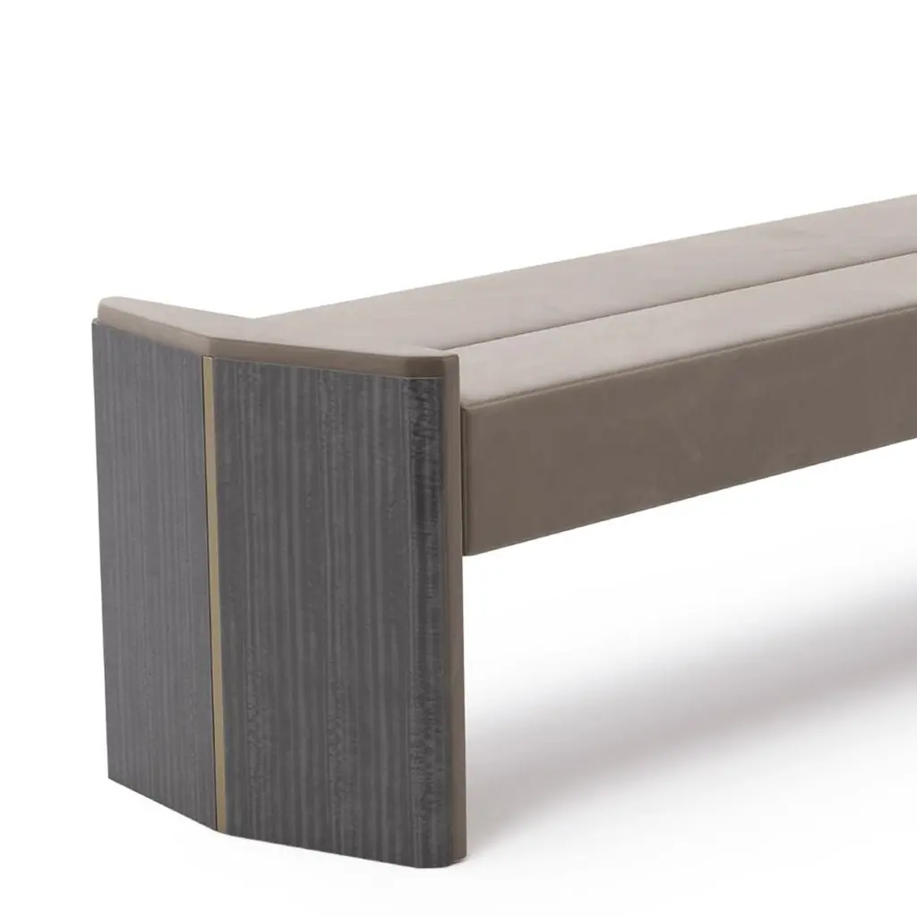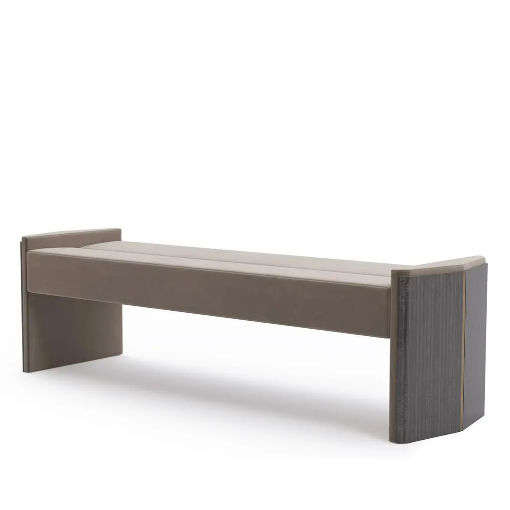 Bench Grace Gray with solid wooden structure upholstered and coveredwith grey velvet fabric, bench with 2 feets in wood with eucalyptus veneerwith brass trims in polished finish.