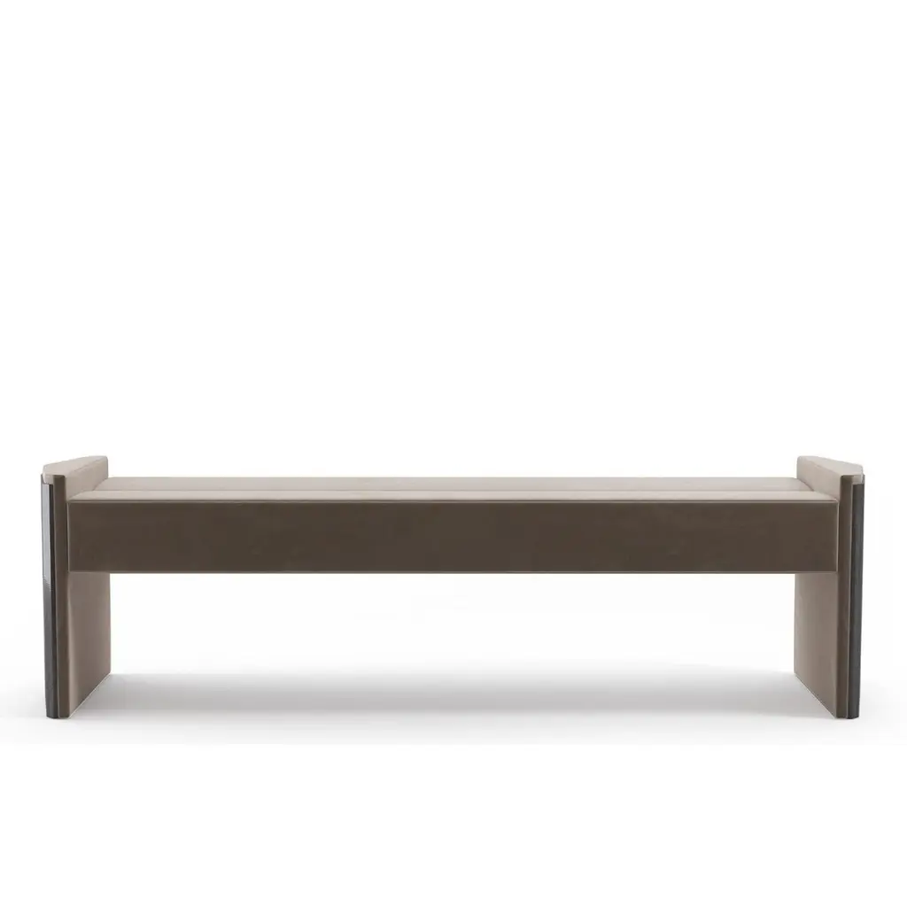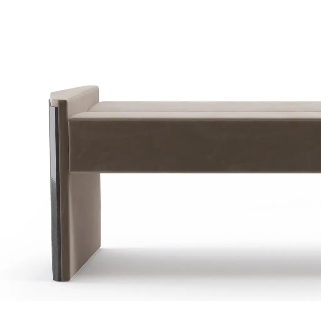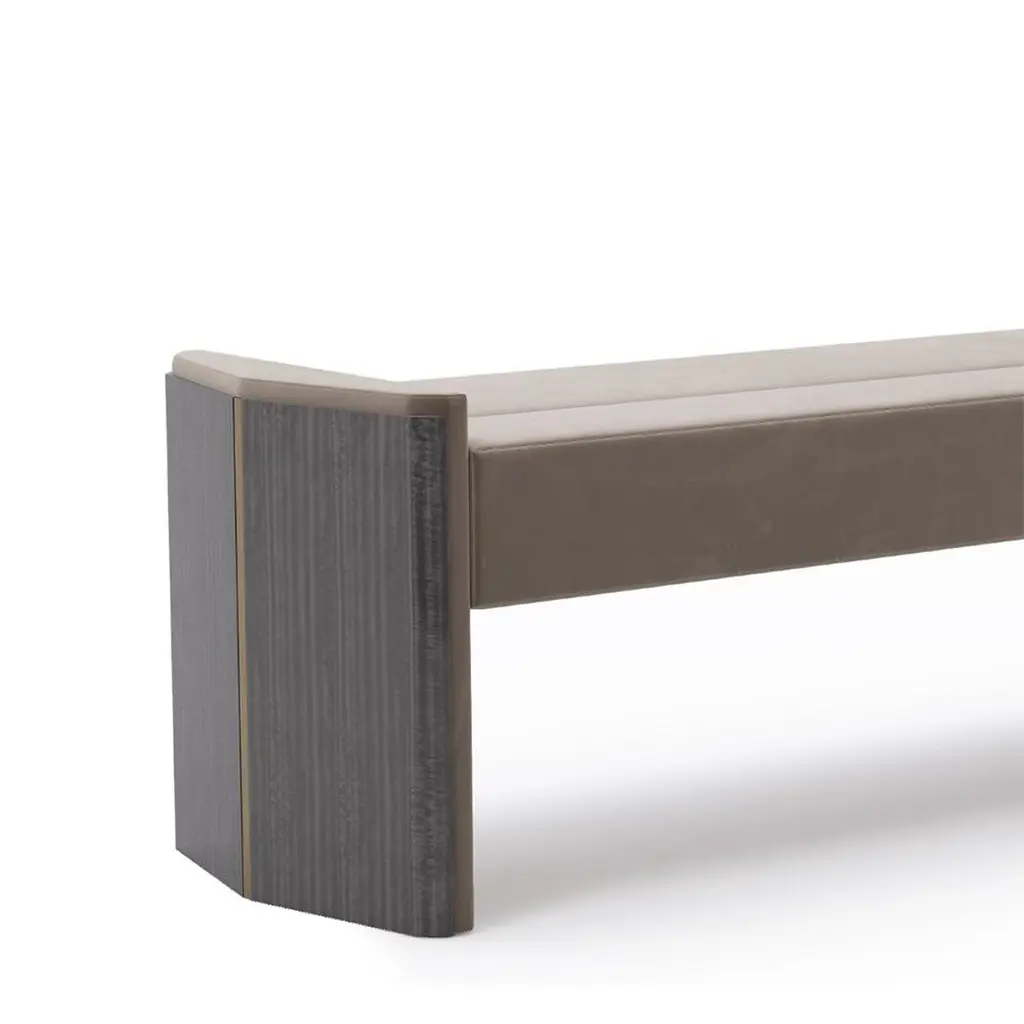 Bench Grace Gray with solid wooden structure upholstered and coveredwith grey velvet fabric, bench with 2 feets in wood with eucalyptus veneerwith brass trims in polished finish.