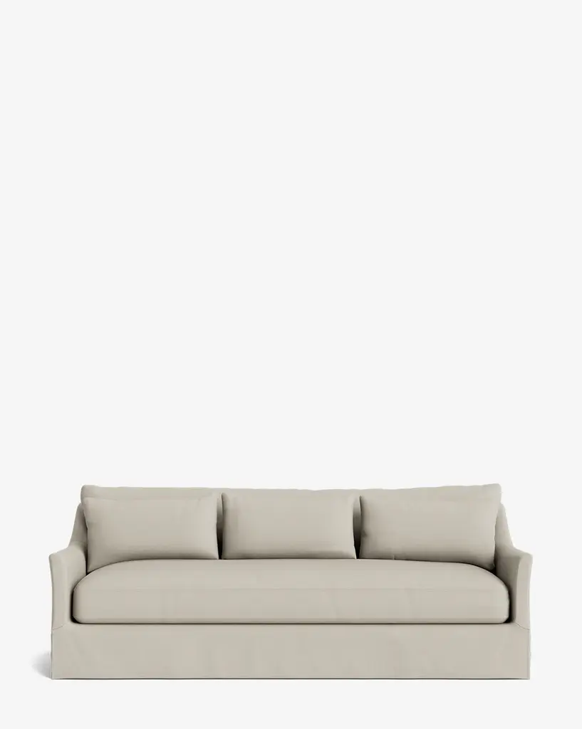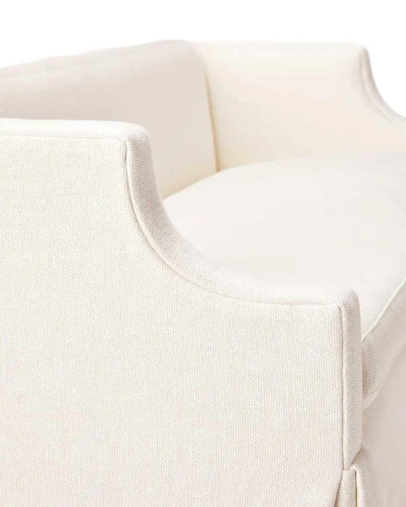 Social graces. A classic silhouette. Upright seat. Lovely notched arms. Delicate piping on back cushions. Tapered feet, skirt, or box pleat.