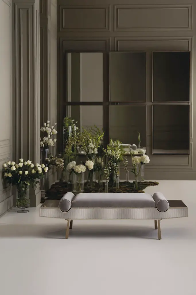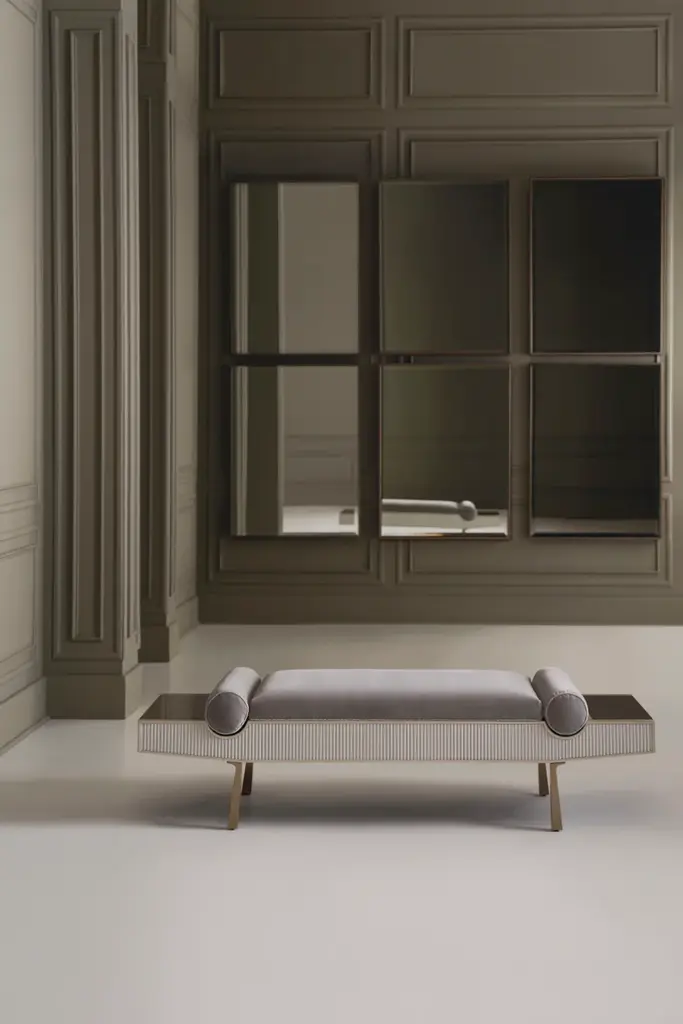 Modern yet elegant in a luxe material mix, this streamlined bench is well-scaled for end-of-bed or an entryway. A reeded apron in a creamy Almond Milk finish brings a sense of rhythm and striking pattern, complemented by a soft gray mohair fabric with a hint of green. Its sleek design featured recessed bolster pillows and opposing metal wings, perfect for placing a book or decorative object. Brushed Gold wraps the ends for a chic finishing touch.