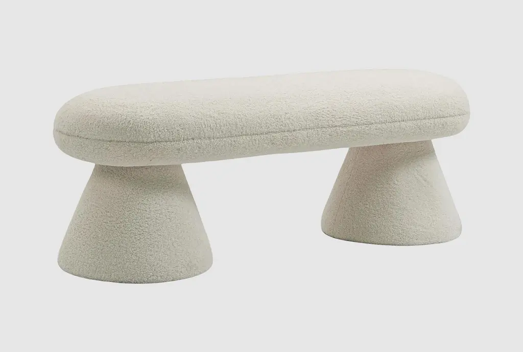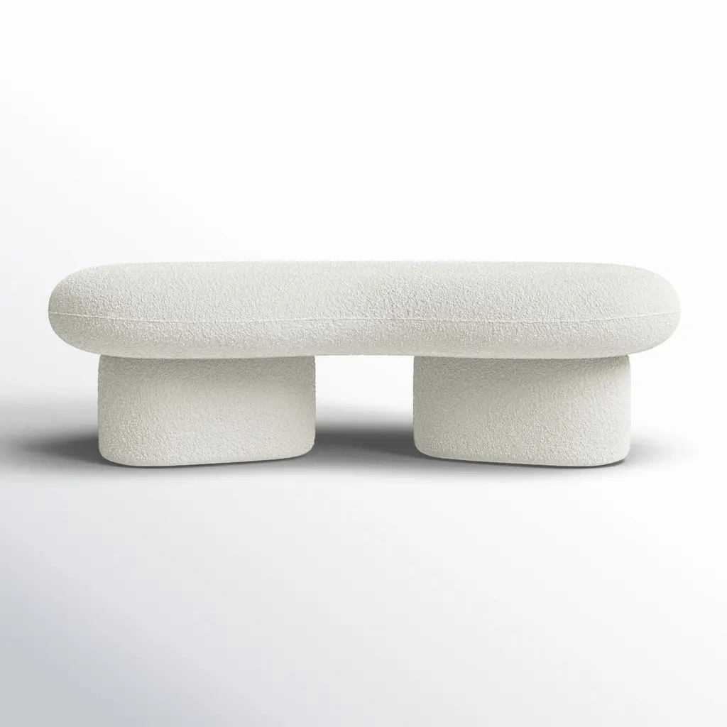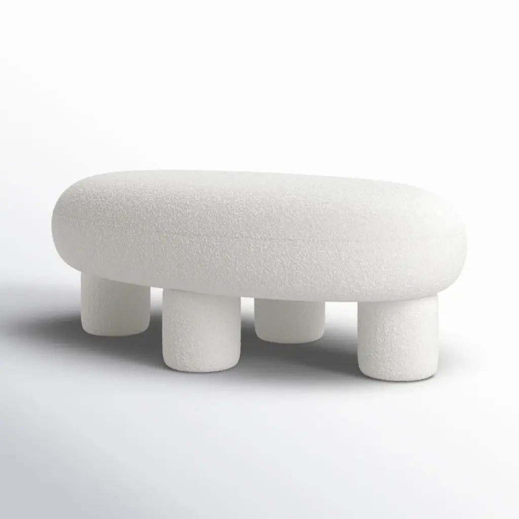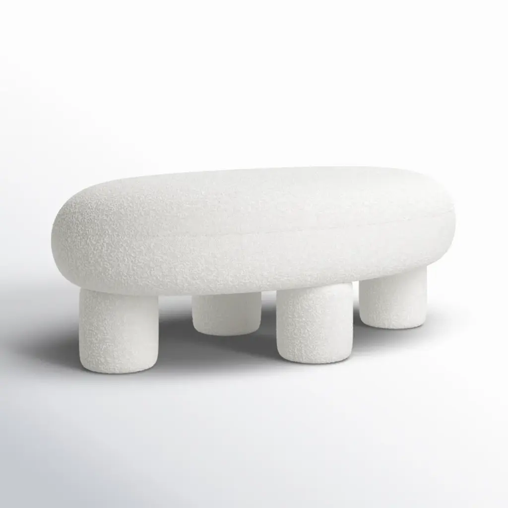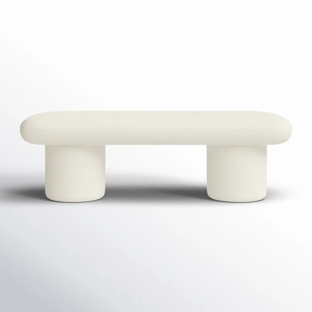 The Greene Modern Off-White Fabric Bench is a fully upholstered bench/ottoman that exudes contemporary elegance. Its off-white color complements various interior styles. Upholstered in 100% polyester fabric, it features a foam cushion fill, four sturdy legs, and a solid pine frame. Ideal for adding both comfort and style to your living space.