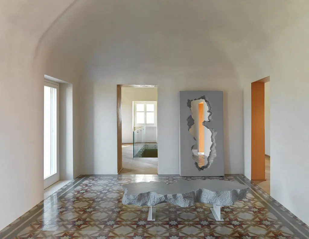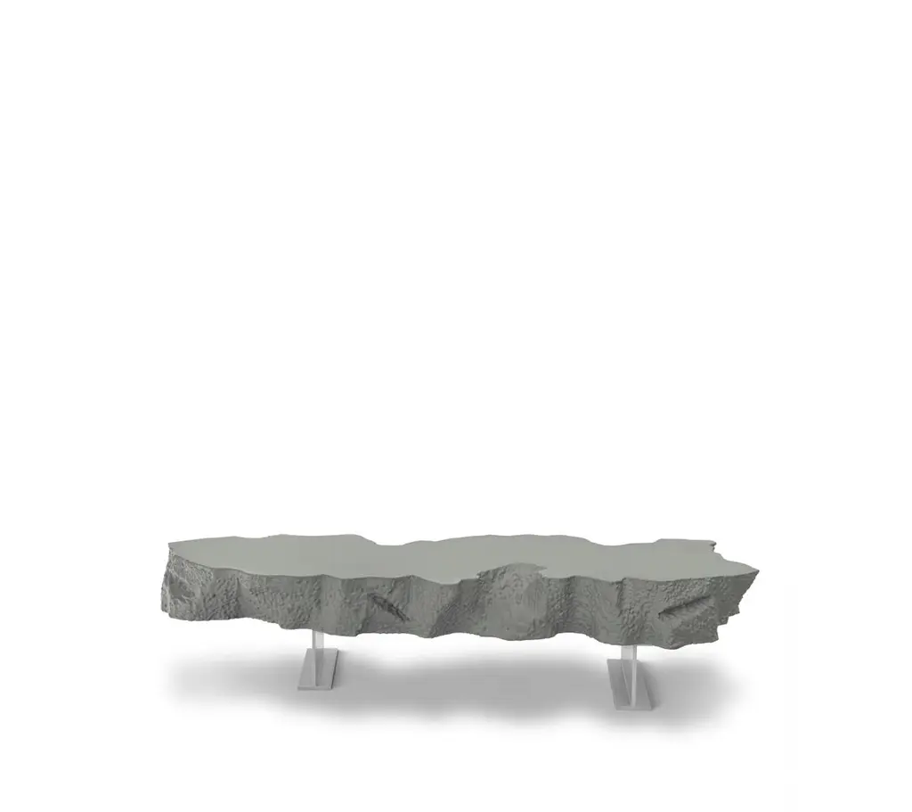 The Broken Bench, an irregular slab of “soft concrete” in polyurethane, seems to be the part missing from the large Broken Mirror, and just like the other pieces of the collection plays with the “short-circuit” between the actual softness of the material and its appearance. An unusual addition both for domestic and public spaces, the bench is supported by beams in a highly resistant plastic agglomerate which highlights the piece’s industrial look.The polyurethane framing the mirror is rough-hewn entirely by hand; for this reason each Broken Mirror piece is slightly different from another, and it is thus a unique item. Open edition.Production lead times are often flexible and stock levels vary.Materials:Metal supports and seat in soft polyurethane hand finished with Guflac.Dimensions:190 x70 x 43 cm.NB. LANDED PRICE USA, shipments details to enquire