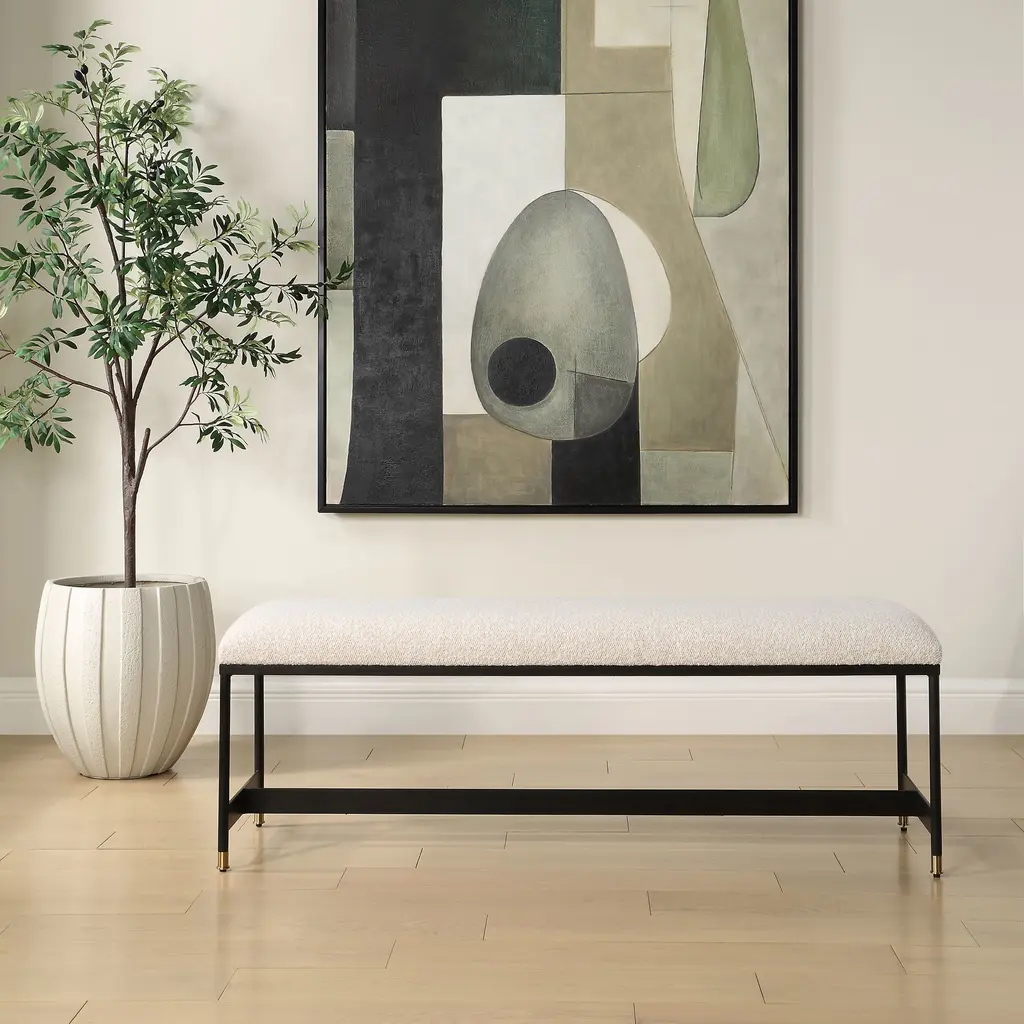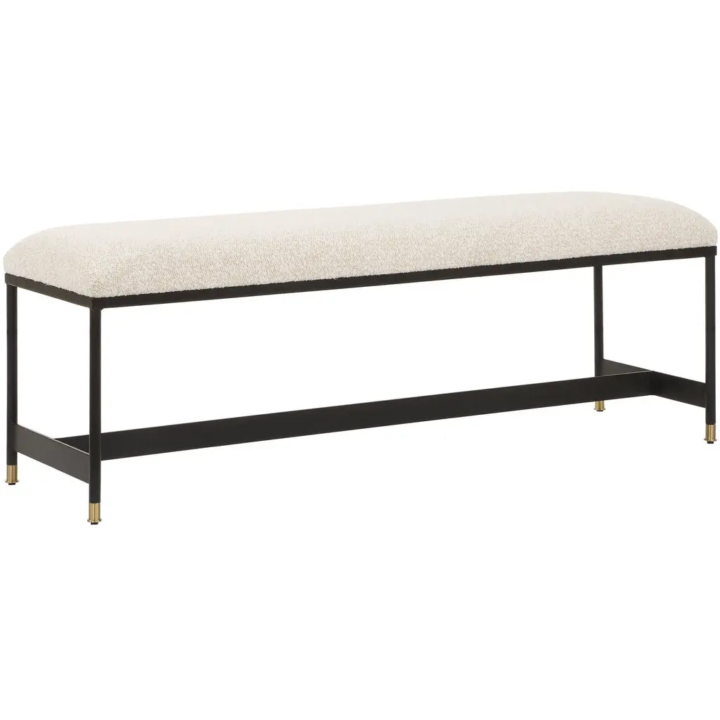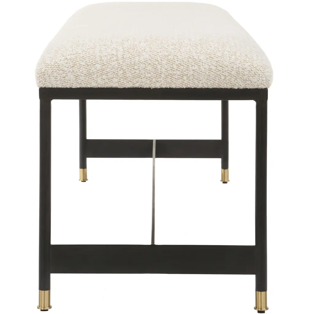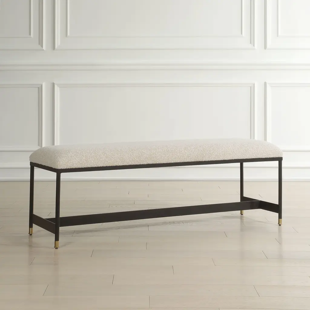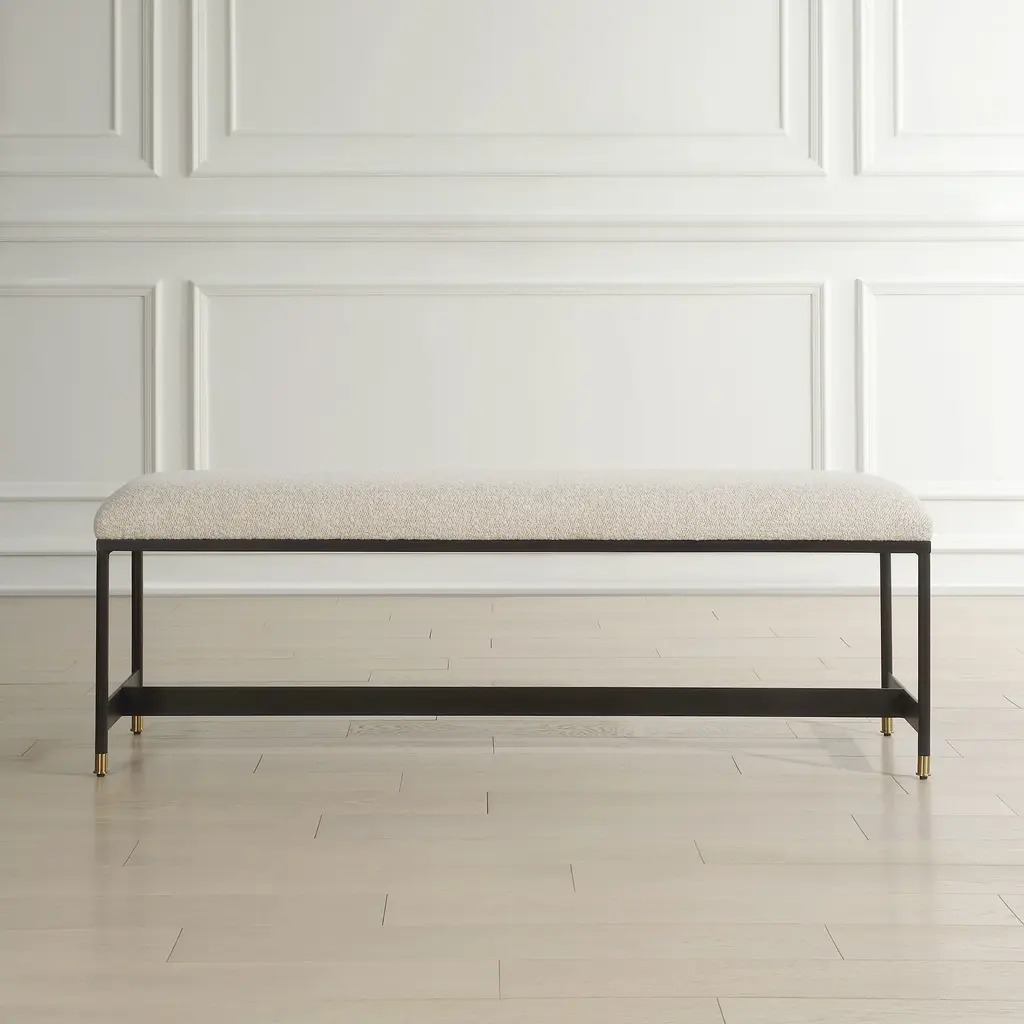 This Bench Features A Sleek Matte Black Iron Frame And Is Paired With A Plush Upholstered Seat In A Casual Off-white Polyester Blend With Wool-like Texture, Accented With Petite Brushed Brass Feet Caps.