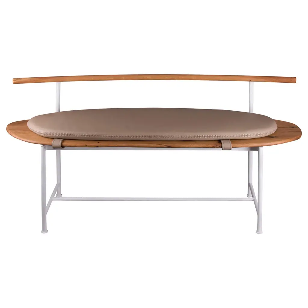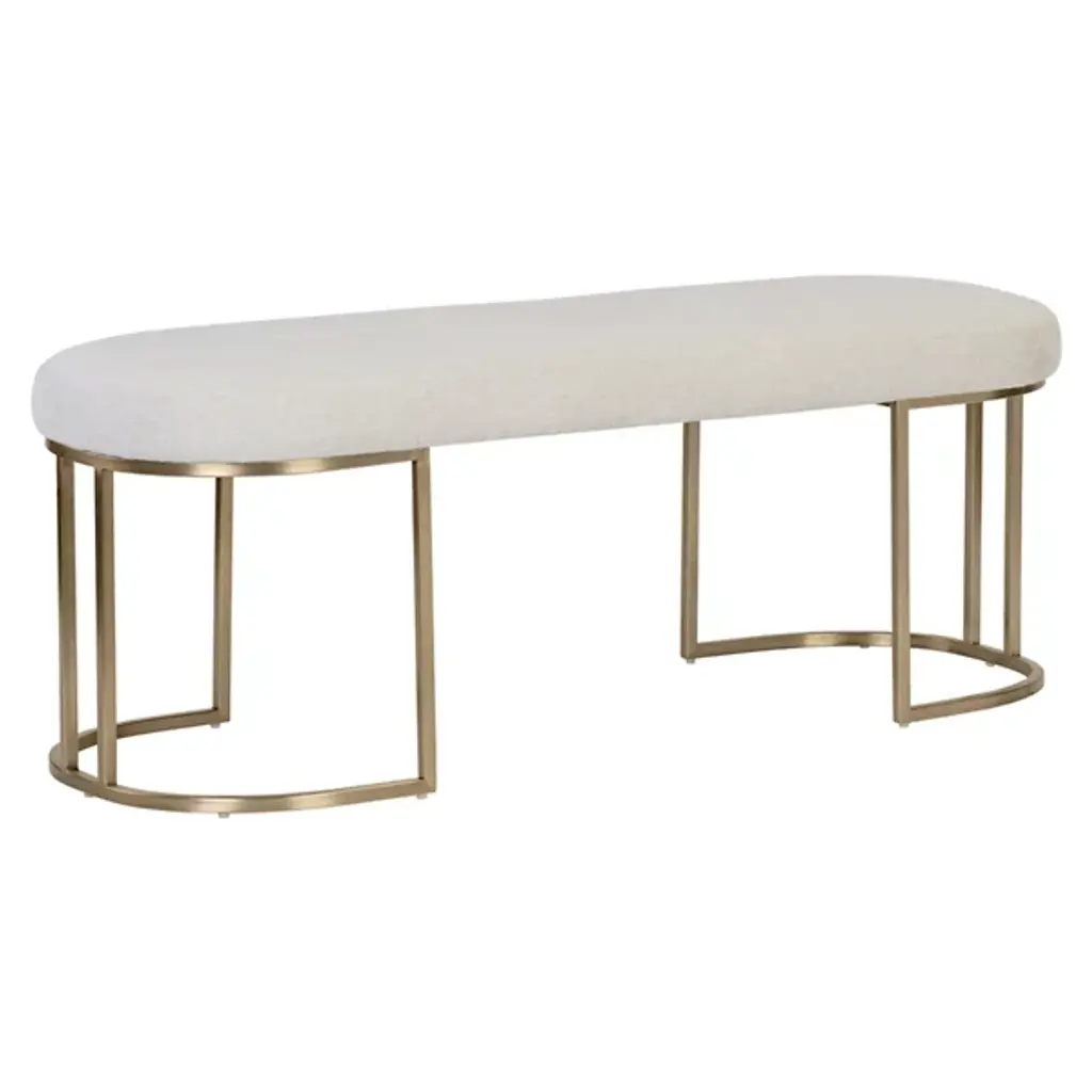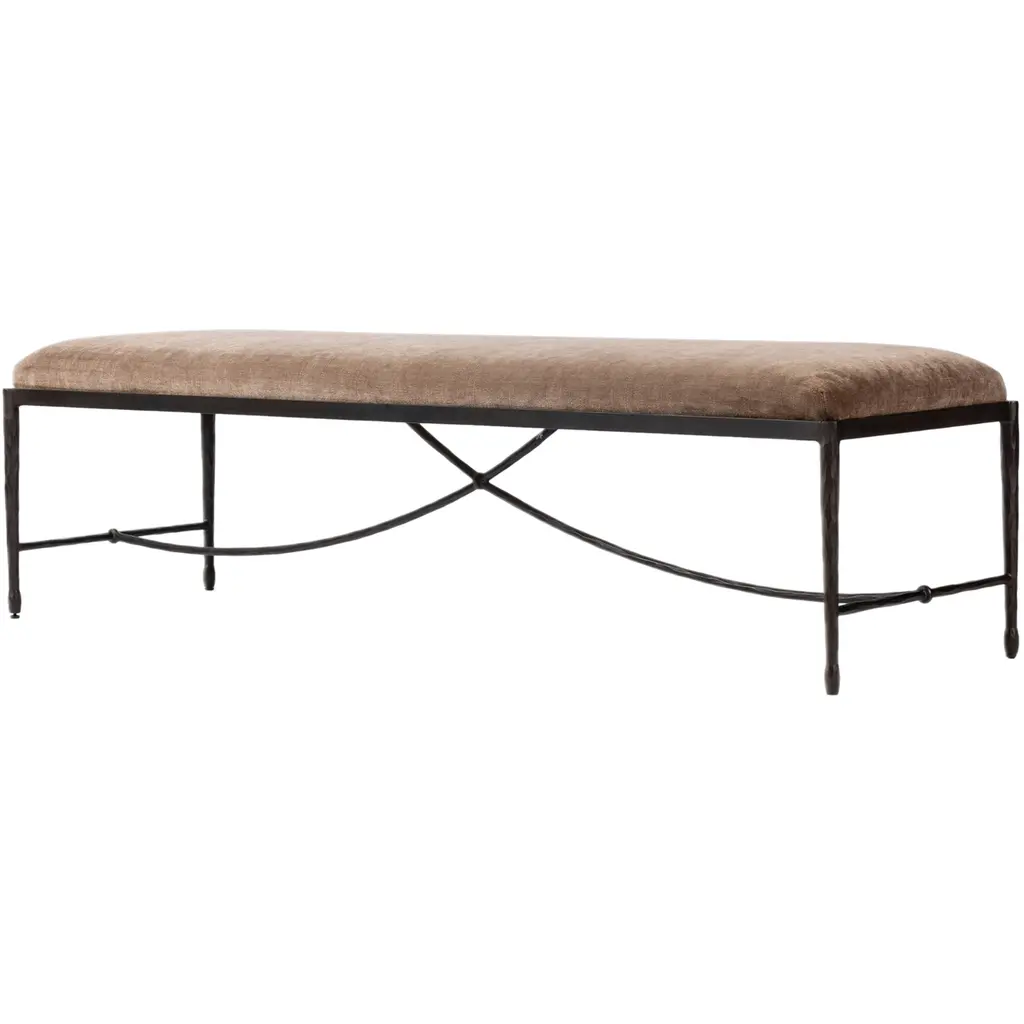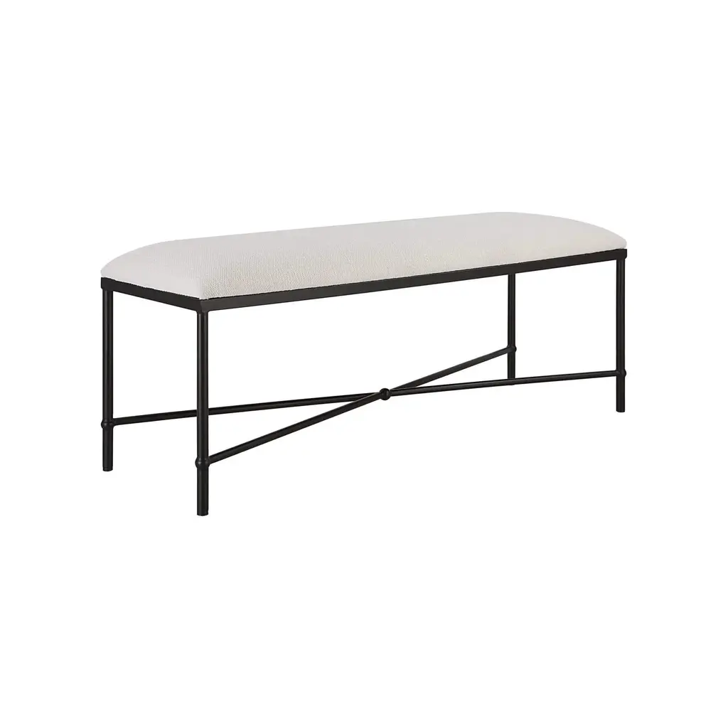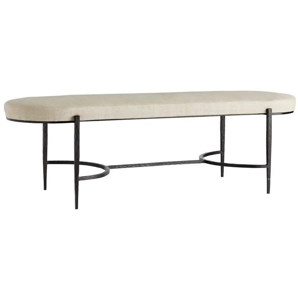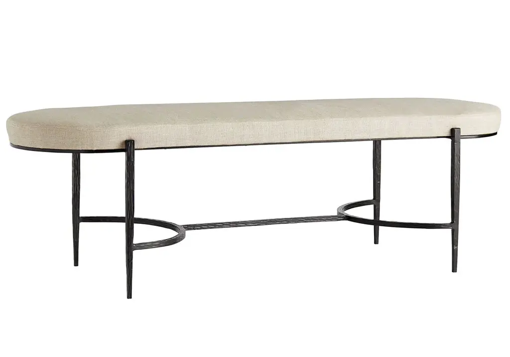 The Hanson showcases a curved silhouette with its elongated natural linen cushion and thin textured iron base. Its transitional design styles easily in entryways, hallways, or at the end of a bed for a touch of simple sophistication.