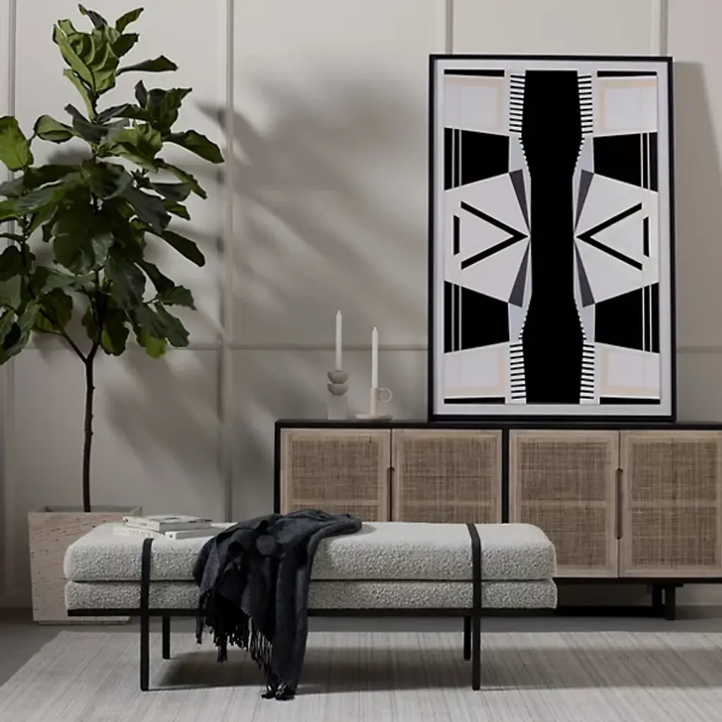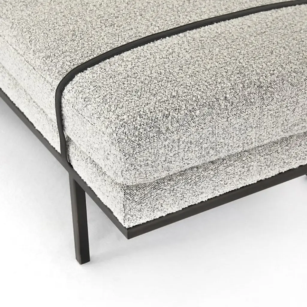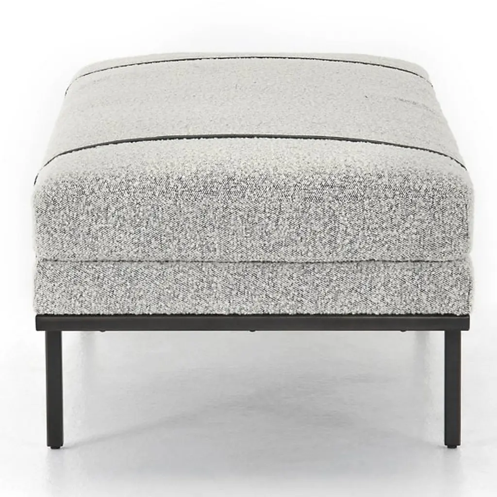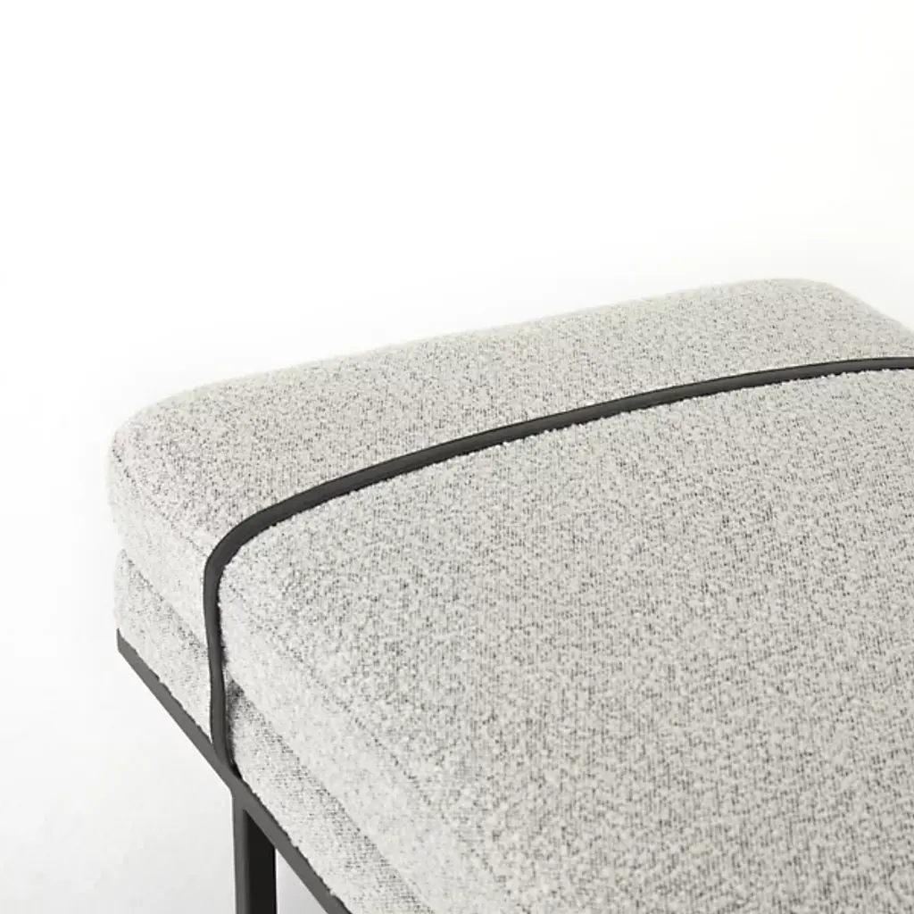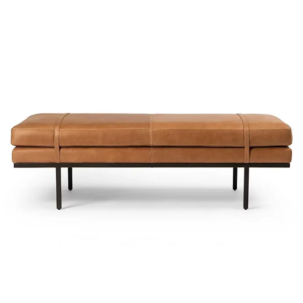 Deliver a dash of style and restfulness to key areas with the Harris Accent Bench from Four Hands. This dapper piece delights in its 2-tone design. The slender metal frame gives the bench a subtle floating sensation. Top-grain leather straps wrap over the top for a touch of contrast. Wide cushions spread out to offer a small group pleasant seating. These cushions sport a soft yet strong performance fabric designed to withstand spills, stains, and long-term wear.