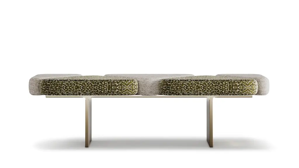 The Harrison Bench is a bold statement of modern design, seamlessly blending geometric precision with plush comfort. Its sculptural silhouette, featuring asymmetrical upholstered cushions, creates a dynamic visual rhythm, while the sleek metal base enhances its contemporary appeal. Designed for versatility, the Harrison Bench brings both style and function to any sophisticated interior.With its distinctive floating effect and asymmetrical cushion arrangement, the Harrison Bench strikes the perfect balance between artistry and functionality, making it a standout addition to any space.Available in multiple sizes or fully customizable to fit your specific space and design requirements.Generously cushioned seating with a combination of rich textures and refined patterns provides both visual interest and superior comfort.Whether placed in an entryway, lounge, or bedroom, the Harrison Bench adds a refined touch of modern sophistication to any interior.
