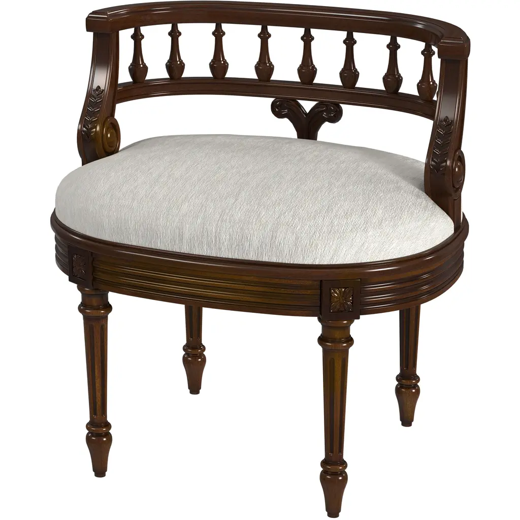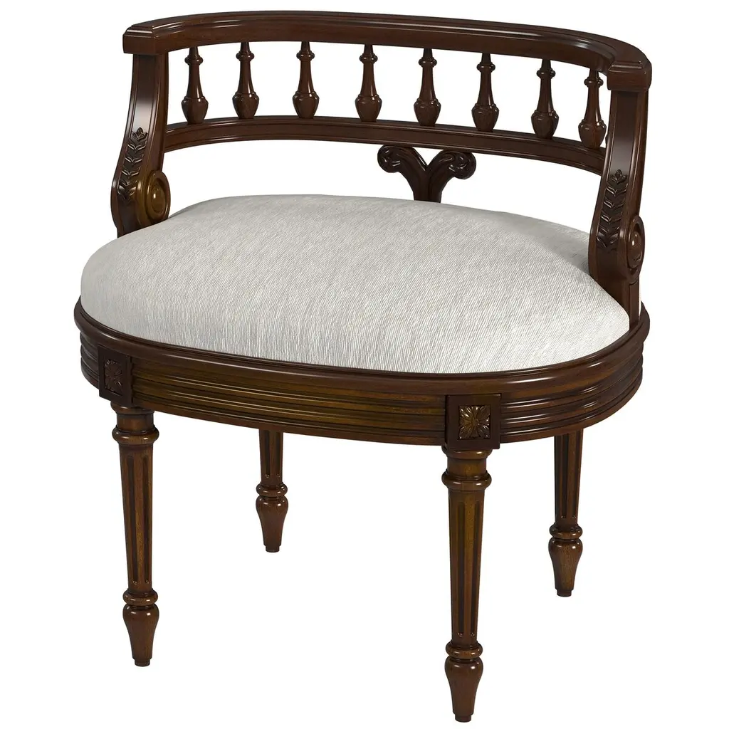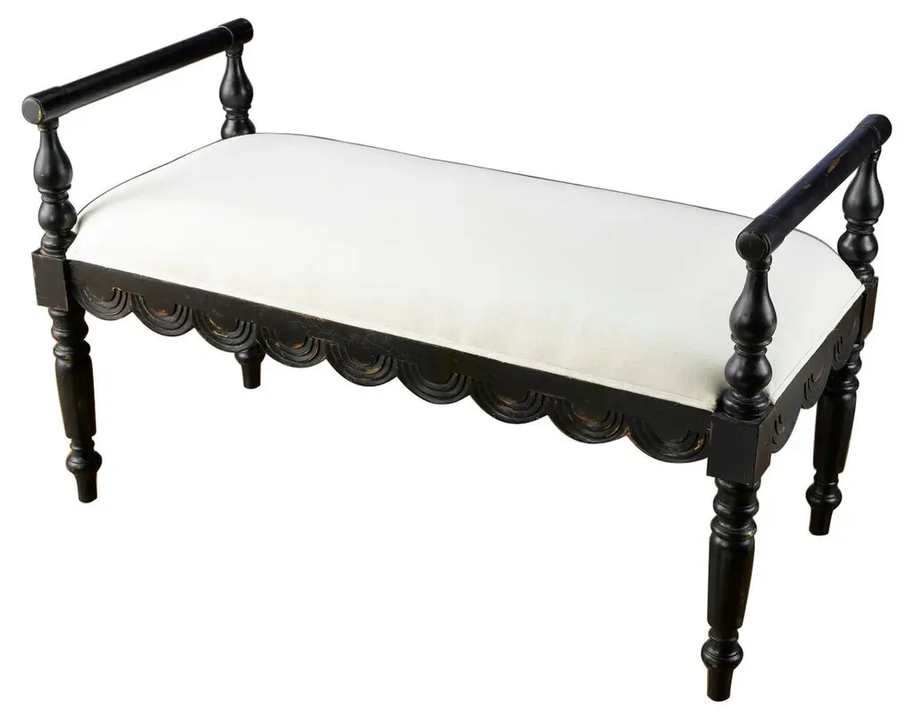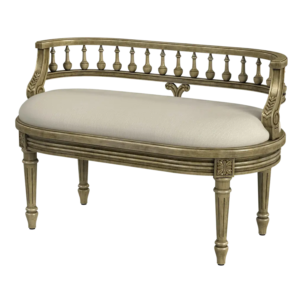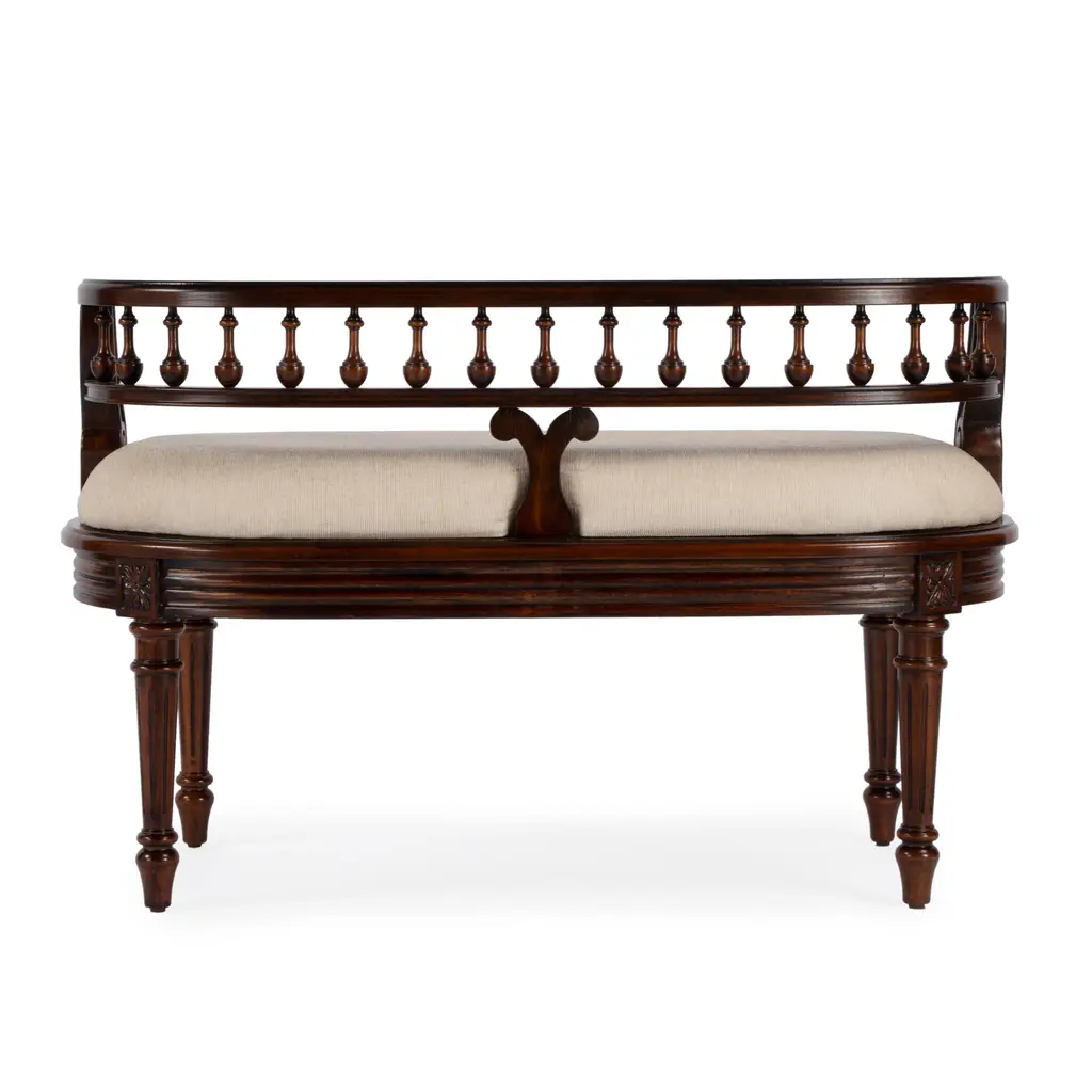 The Beautiful Hathaway 37" bench in a cherry finish will infuse elegance into virtually any decor. Handcrafted from rubberwood solids and wood products, it features a carved spindle back, fluted turned legs and ballerina feet. The generously sized cream colored seat cushion is upholstered in an cotton hobnail fabric and features floral appliques on the seat apron. Durably Constructed With: Rubberwood, Cherry Veneer, Fiberboard, Cotton Fabric, Urethane Foam Ideal for use in a Hallway, Entryway, Bedroom, Bathroom, Livingroom Product Construction Features: Natural Wood Grain Color Variation,No Distressing,Upholstered,Adjustable Height: No Product Assembled Measurement & Weight: 24.0" H x 37.0" W x 19.0" D -- 39.0 lbs. Seat: 17.5"H Low back measuring 36.5W x 1.325D x 6.5H Spacious seat area measuring 38W x 18D x 3"H Leg dimensions: 1.75 x 1.75 x 11.5, Dims inside legs: 28.5" between font legs, 13.25" front to back legs. Cleaning and Care recommended: Wipe clean with a dry cloth, spot treat only Item Arrives: Needs Assembly Photo may slightly differ from actual item in terms of color/finish due to the lighting during photo shoot or the monitor's display.