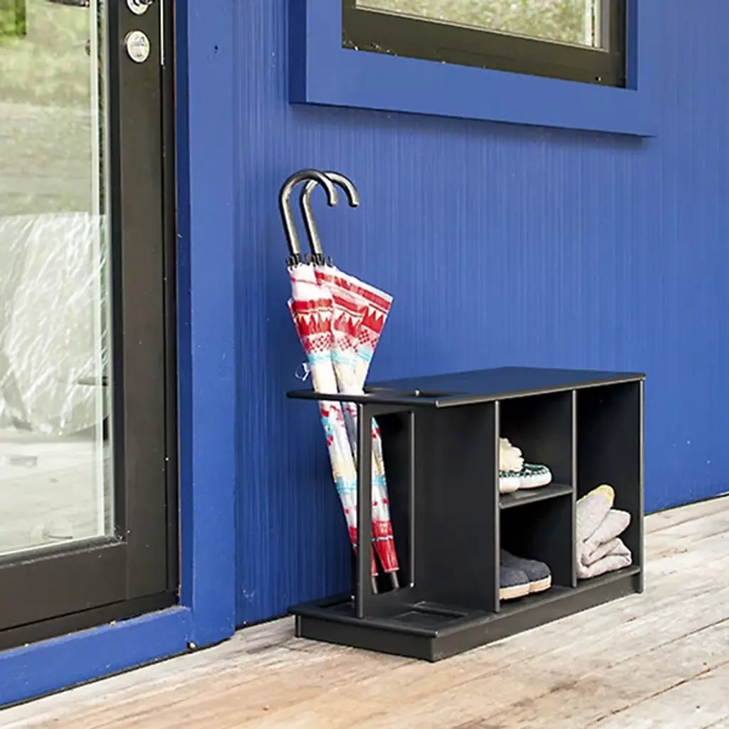 Greet friends and family in sophisticated style with the Hello Entryway Outdoor Bench by Loll. Featuring practical partitioned storage underneath, this bench makes a welcoming addition to your front entryway or mudroom. For rainy days, its open notch end accepts multiple umbrellas and contains drips in a built-in tray as they dry off. Choose from classic or colorful finishes to customize your interior design story with flair.