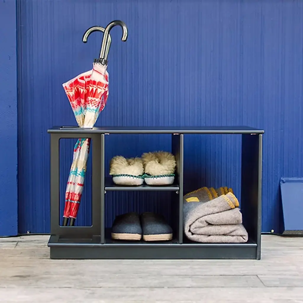Greet friends and family in sophisticated style with the Hello Entryway Outdoor Bench by Loll. Featuring practical partitioned storage underneath, this bench makes a welcoming addition to your front entryway or mudroom. For rainy days, its open notch end accepts multiple umbrellas and contains drips in a built-in tray as they dry off. Choose from classic or colorful finishes to customize your interior design story with flair.