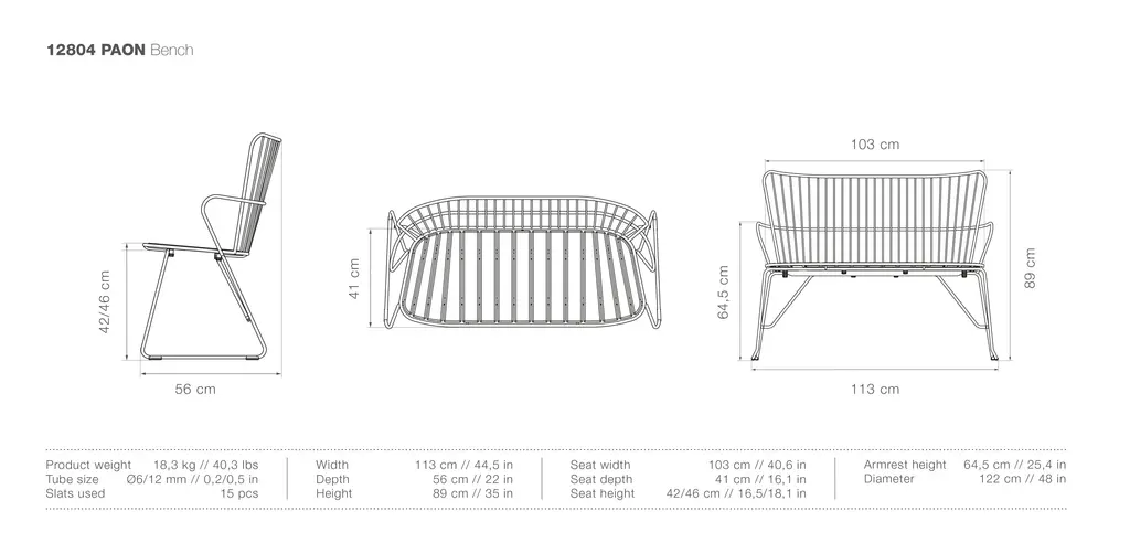 The PAON Bench is the perfect addition to your outdoor living space. Constructed of metal and bamboo lamellas, it is airy and comfortable.
