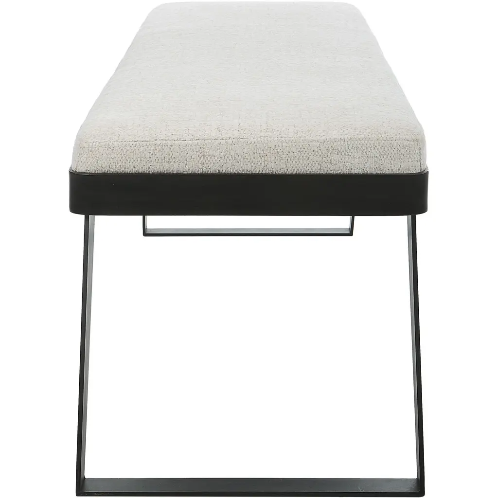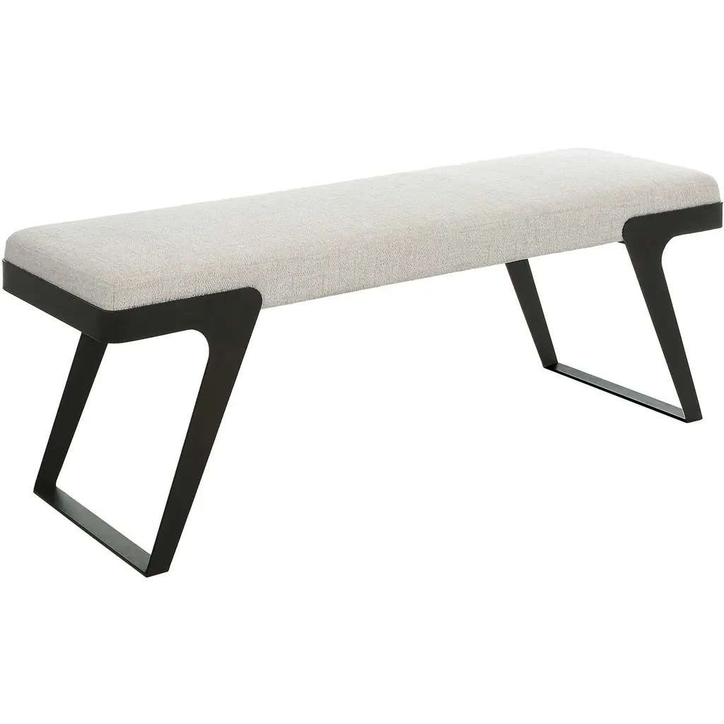 The Modern Hover Bench Is Streamlined With An Aged Black Curved Iron Base And Cushioned Seat. Upholstered In A Soft White Boucle Performance Fabric.