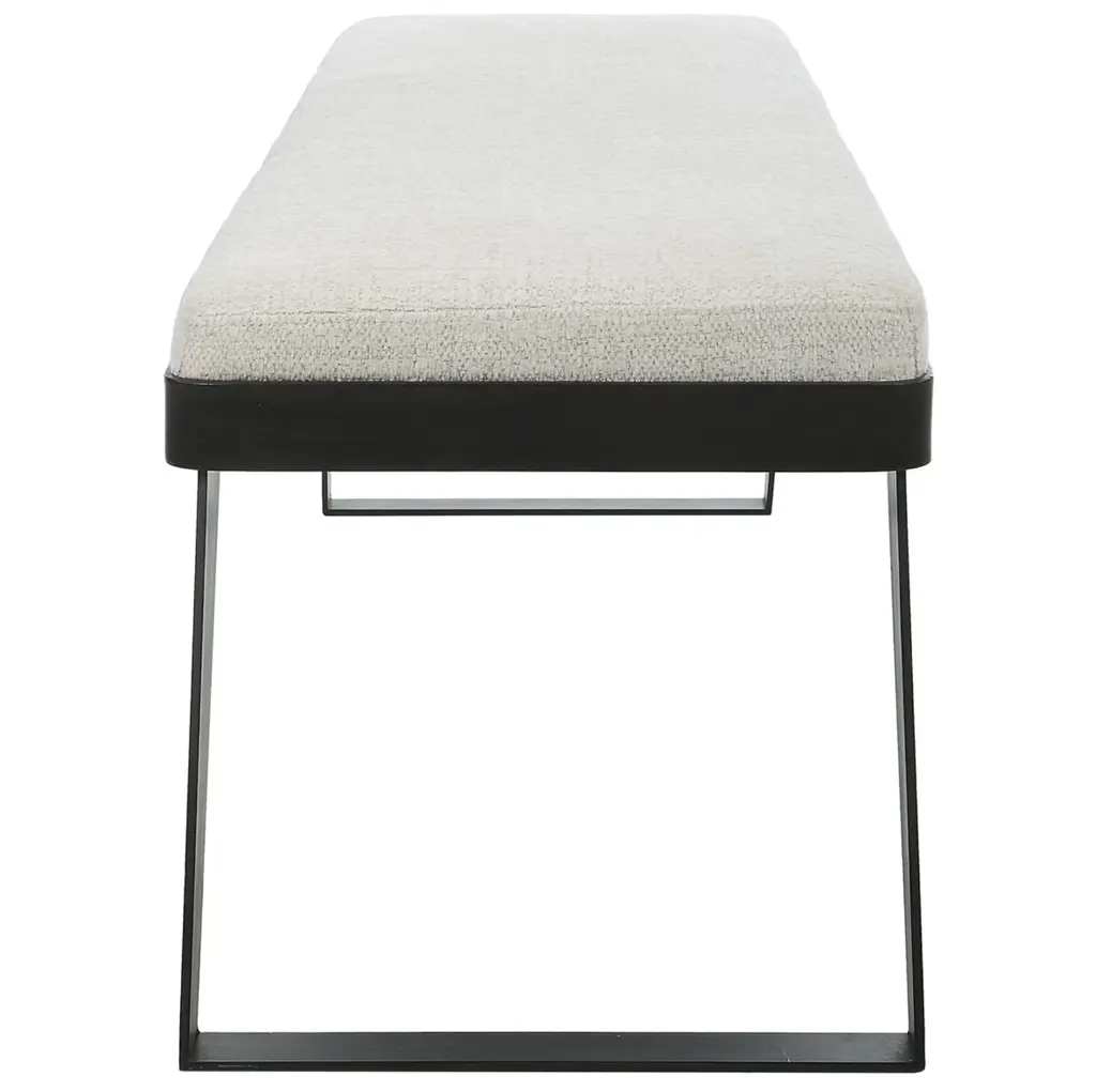 The Hover bench features a contemporary design, complete with a curved iron base in an aged black finish and an ivory chenille boucle performance fabric cushioned seat.
