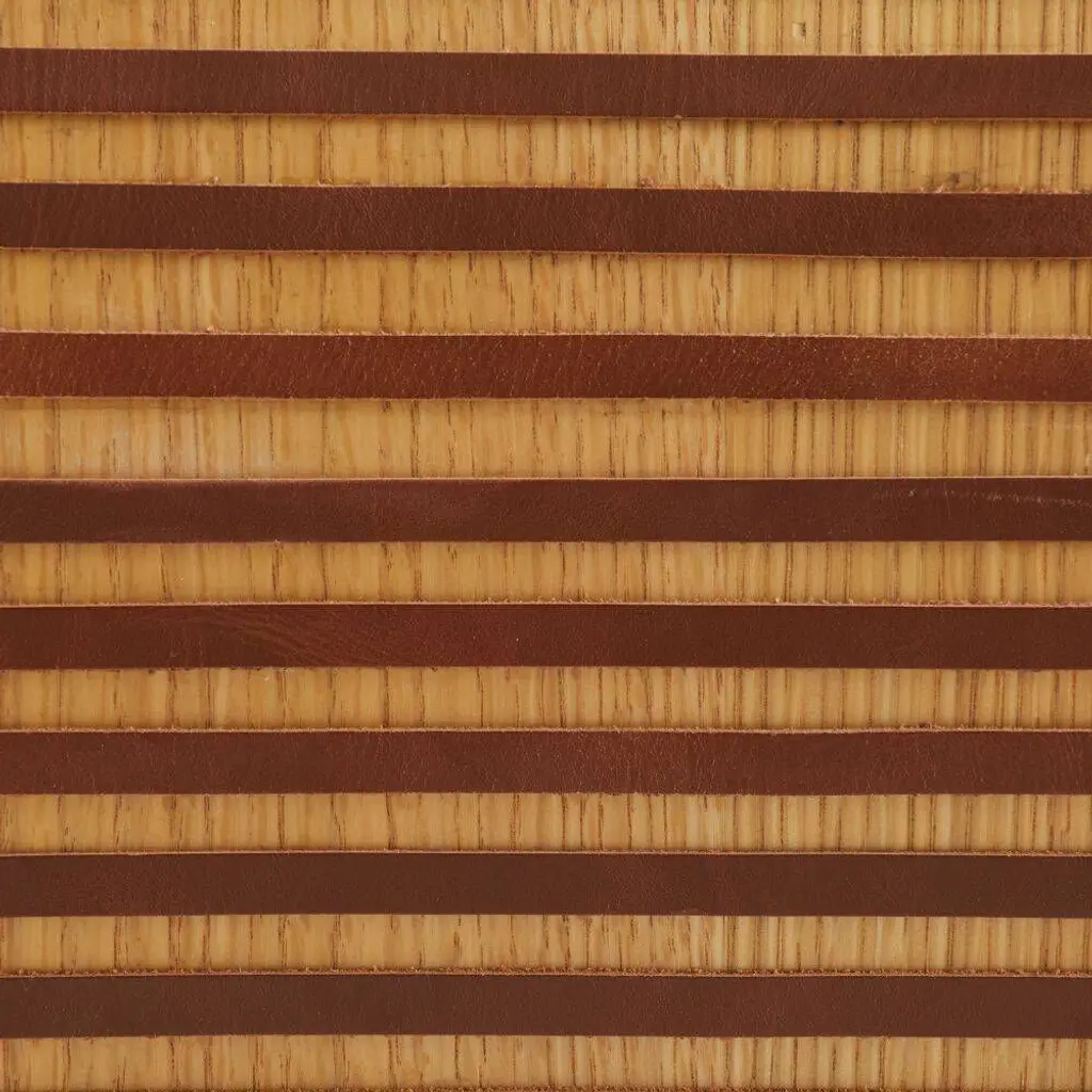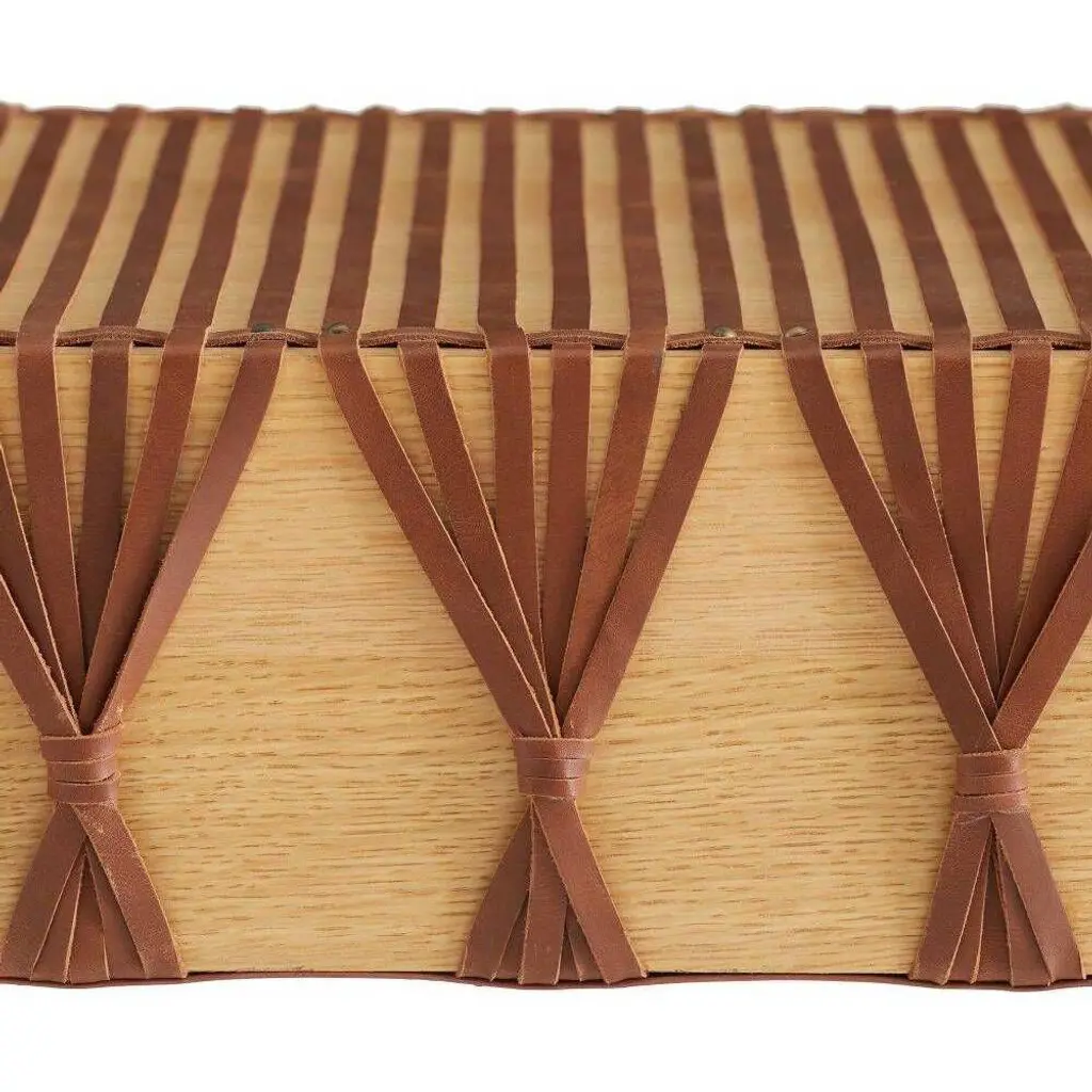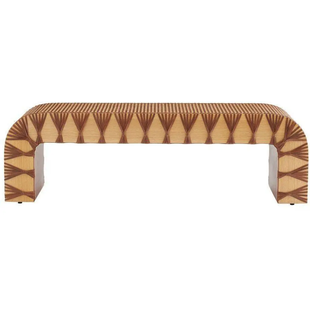 Strands of leather in a deep russet hue are intricately woven around a waterfall bench of natural oak wood. Inspired by a braided horse's mane, the rhythmic pattern is repeated along each side and secured with antique brass nail heads. The underside of this stylish bench is clad in matching leather. Leather will vary.