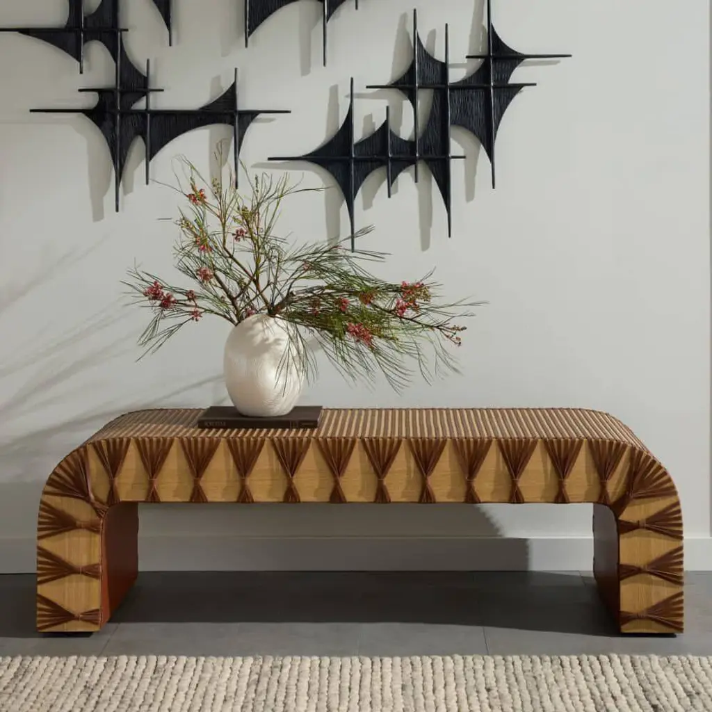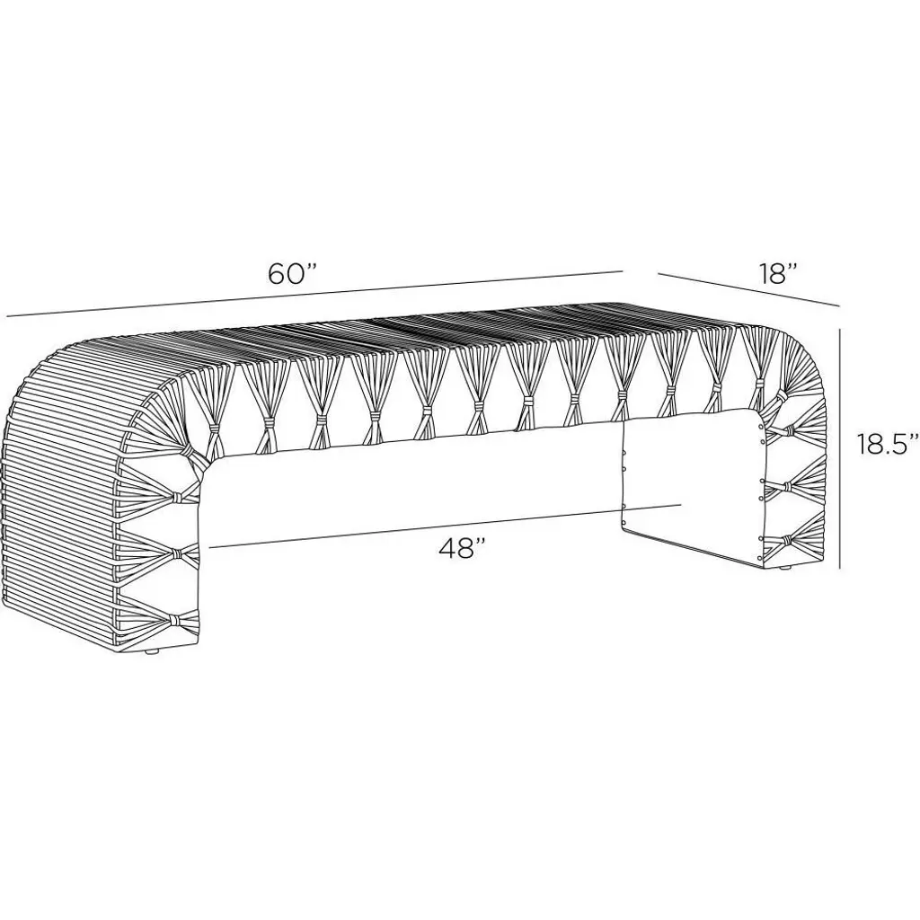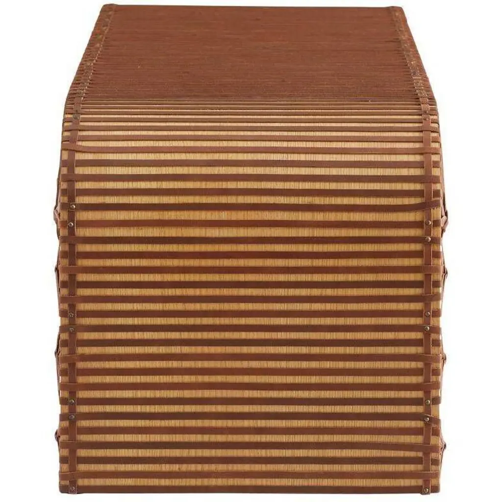 Strands of leather in a deep russet hue are intricately woven around a waterfall bench of natural oak wood. Inspired by a braided horse's mane, the rhythmic pattern is repeated along each side and secured with antique brass nail heads. The underside of this stylish bench is clad in matching leather. Leather will vary.