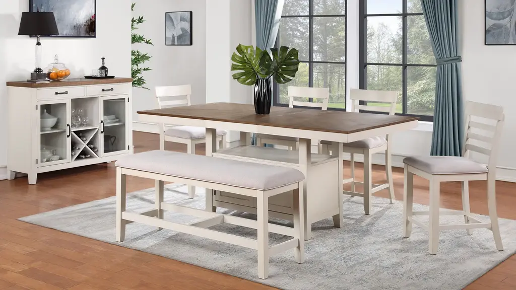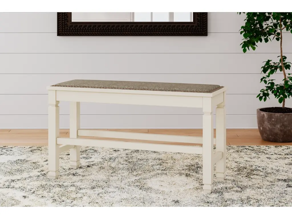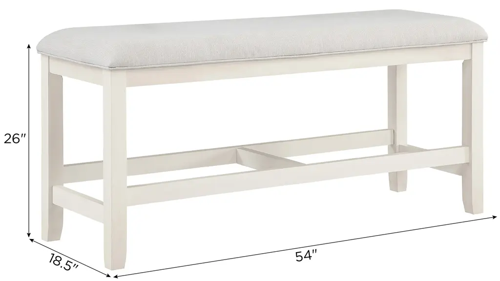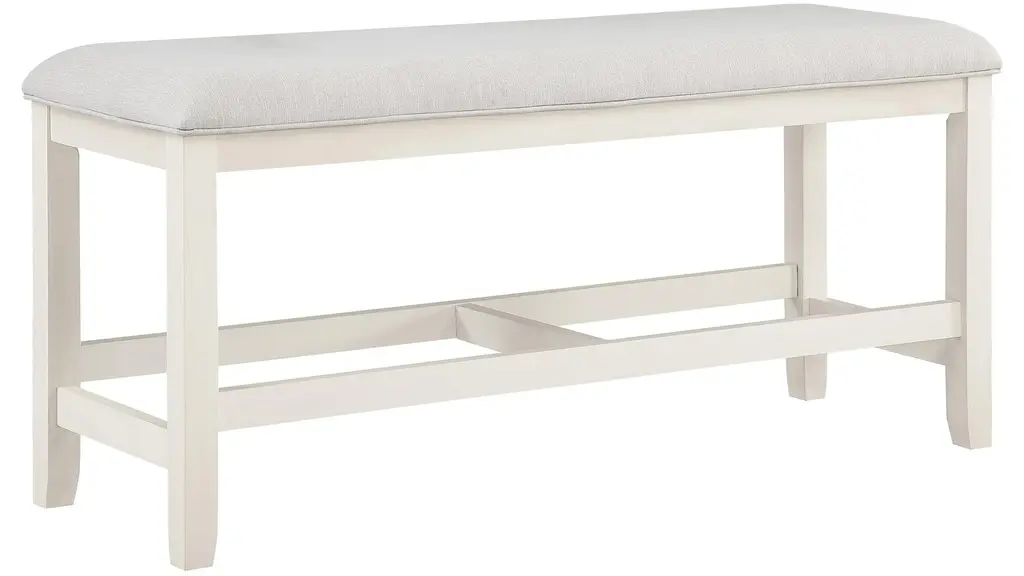 The Hyland Counter Bench offers a clean look that invites lingering with its plush foam-filled seat. A cream-colored polyester fabric is easy-care and adds to the fresh, airy look.