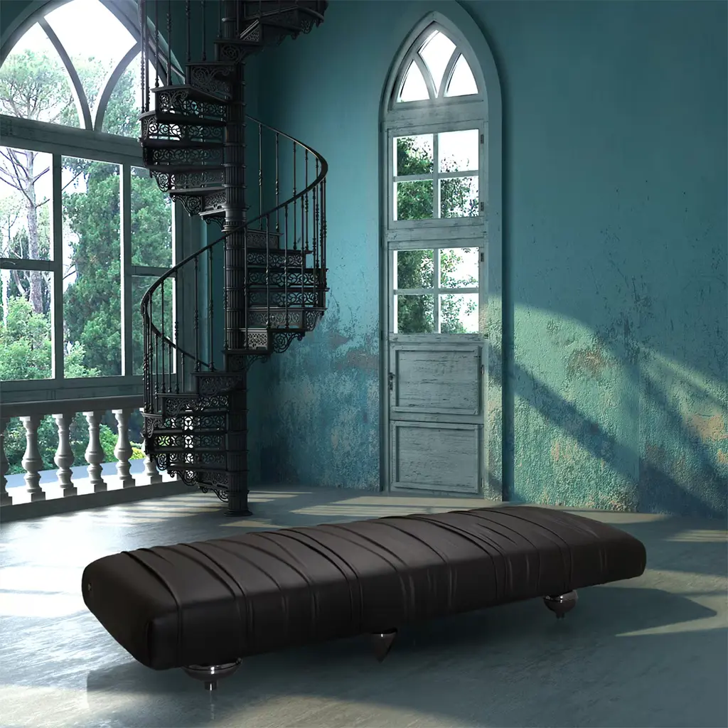 Il Pezzo 1 Bench is finely upholstered with black high-quality leather with an original technique that makes these pieces sophisticated and rich. The feet are made of sand brass casting in gold finish.A small brass cylinder inserted in every piece, containing the serial number, seals the authenticity and uniqueness. Available in custom sizes and finishes.
