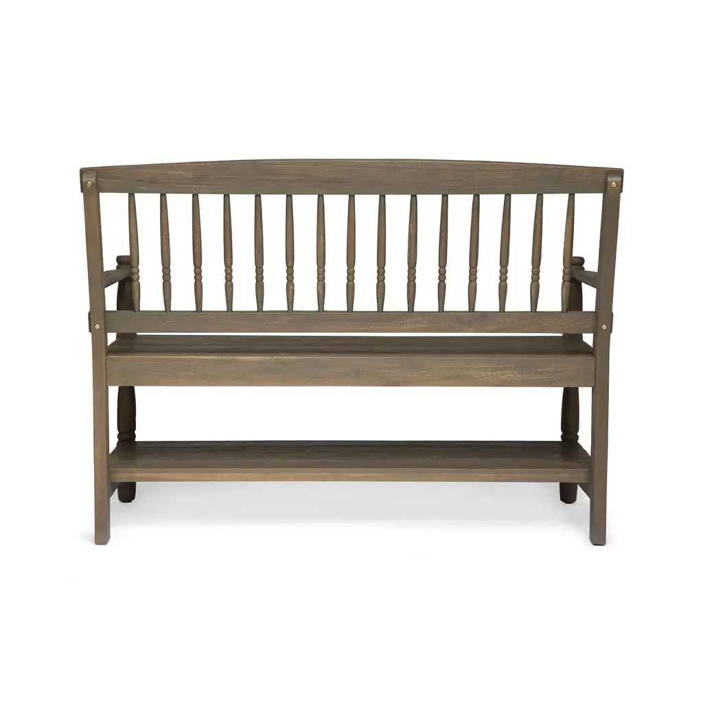 Classic and timeless, this farmhouse Bench with a built-in shelf will not only add beauty to your home, but also act as a practical, understated means of storing previously cluttered possessions. With delicately carved Acacia wood details and a Sturdy frame, this piece is a gorgeous Sight to beholdIncludes: one (1) Bench. Material: Acacia wood. Finish: GrayArm Finish: Black. Assembly required. Hand crafted detailsDimensions: 23. 00 inches deep x 51. 00 inches wide x 36. 00 inches high. Seat Dimensions: 17. 75 inches deep x 45. 25 inches wide x 17. 75 inches highArm Height: 24. 75 inches