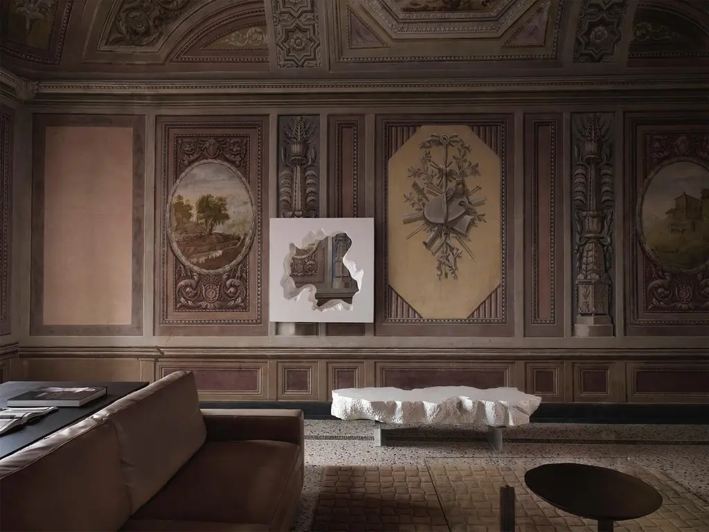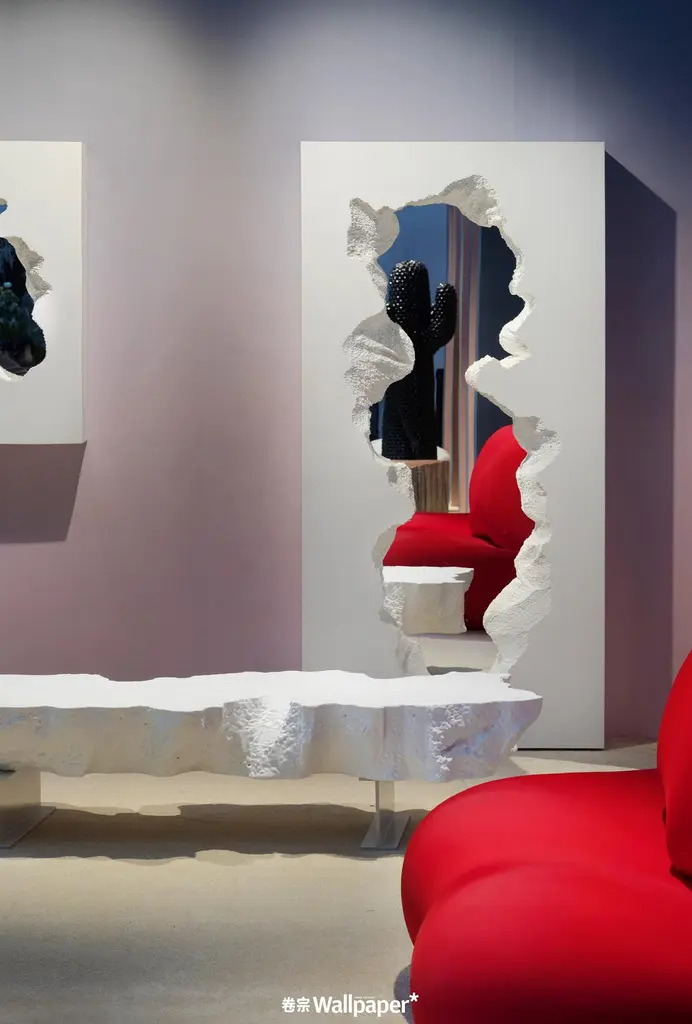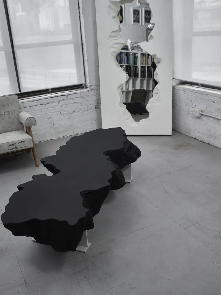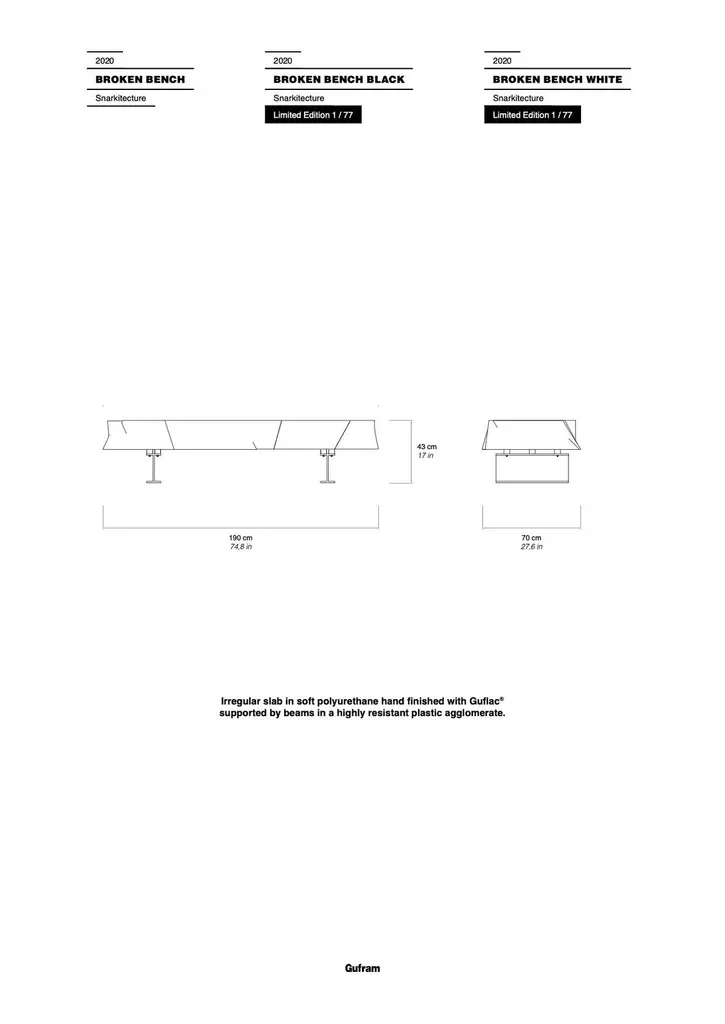 Broken Series consists of broken mirror, broken square mirror, and broken bench. Each item is available in three colors: Grey, black (limited edition of 77), and white (limited edition of 77).Broken mirror is a mirror born from the encounter between Gufram and New York Snarkitecture studio (founded by Daniel Arsham and Alex Mustonen). The reflecting surface is surrounded by a frame of soft polyurethane, a direct reference to Gufram's material par excellence; this creates an alienating optical effect as if the room opened up on the outside world or another environment. The polyurethane framing the mirror is rough-hewn entirely by hand; for this reason, each broken mirror piece is slightly different from another, and it is thus a unique item. The Broken bench, an irregular slab of “soft concrete” in polyurethane, seems to be the part missing from the large Broken Mirror, and just like the other pieces of the collection plays with the “short-circuit” between the actual softness of the material and its appearance. An unusual addition both for domestic and public spaces, the bench is supported by beams in a highly resistant plastic agglomerate which highlights the piece’s industrial look.Materials: Irregular slab in soft polyurethane hand finished with Guflac, supported by beams in a highly resistant plastic agglomerate. Dimensions: 43 H x 190 W x 70 D cm.