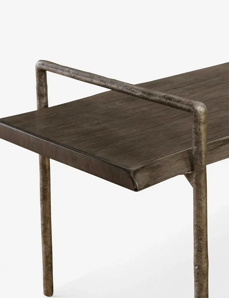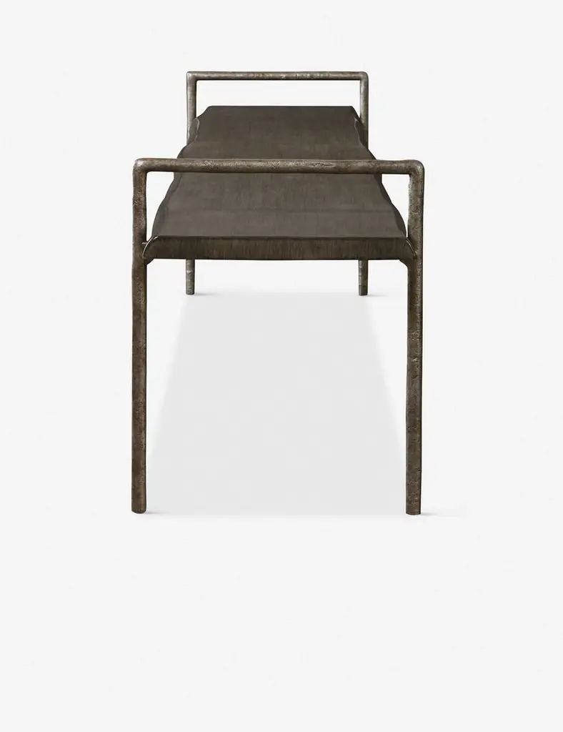 Offering a modern twist on lodge styling, this wooden bench has a sleek dark gray stain and textured iron framing. It's the perfect accent seating for your entryway or even at the foot of your bed.