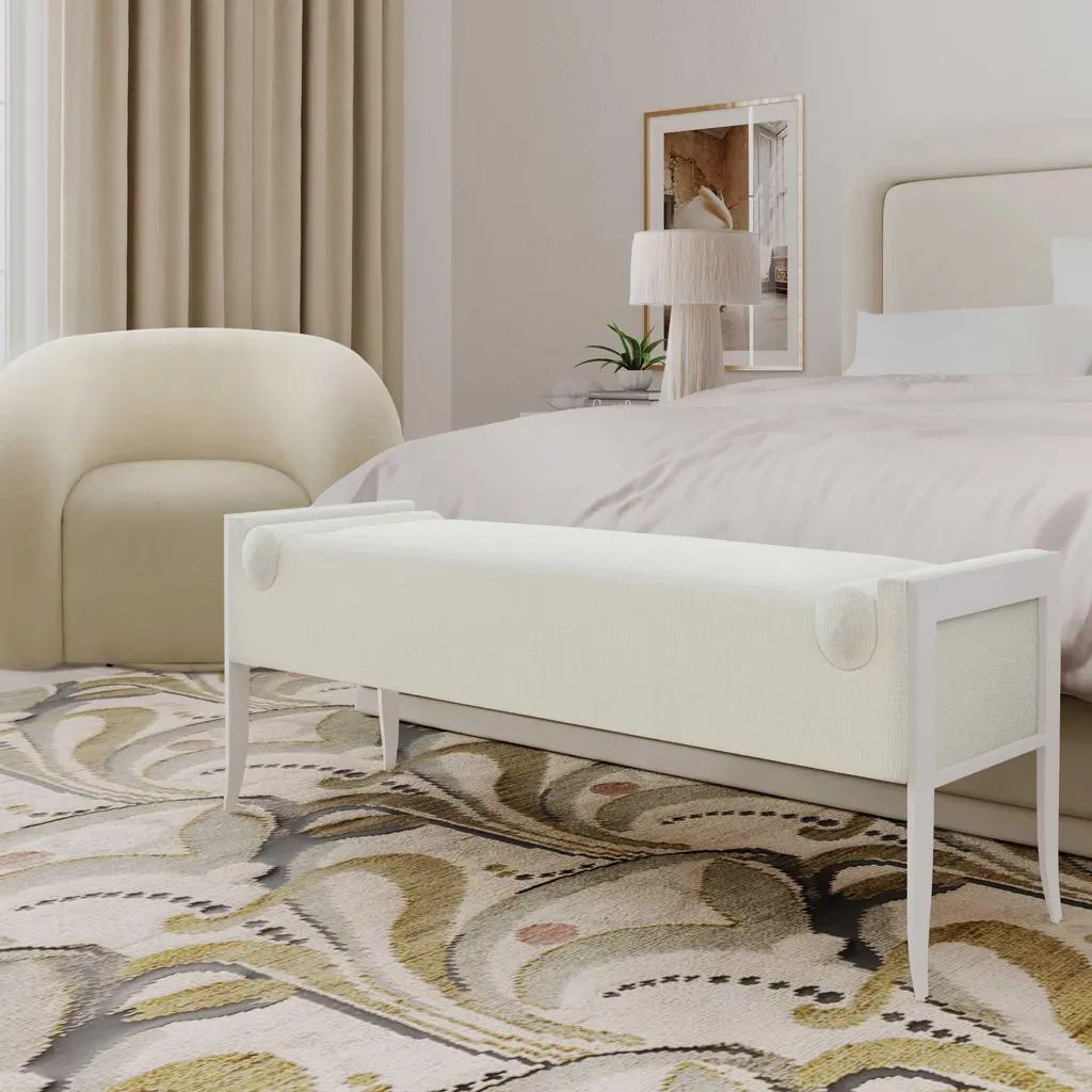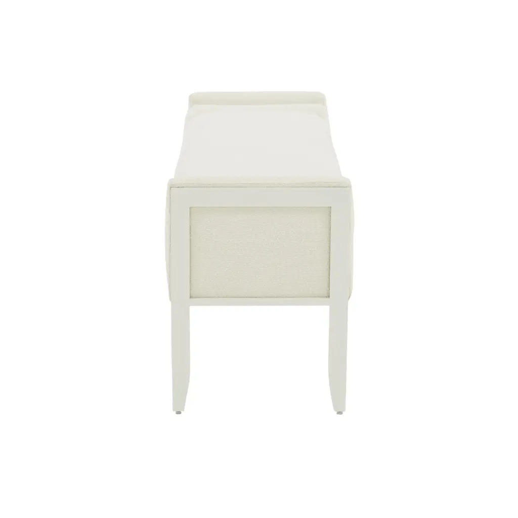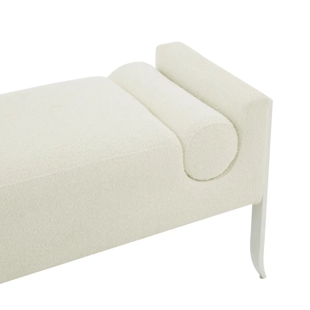 Introducing the Ines Textured Bench - a piece that exudes art deco elegance and is sure to elevate any room with its luxurious design. The deco-inspired design is evident in the bench's angular lines and attached bolster cushions, which are accentuated by the sleek cream stainless steel legs. Available in cream boucle and cream or green textured velvet.