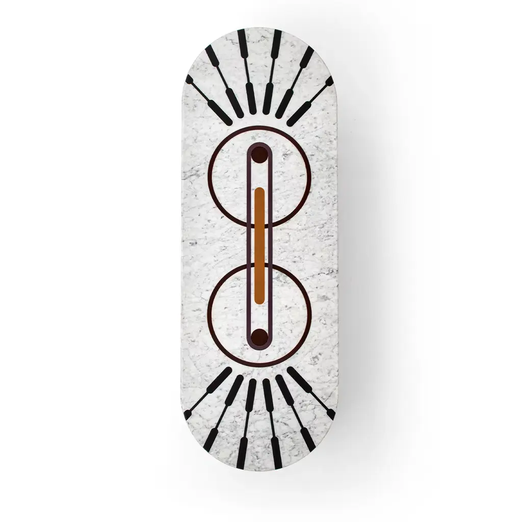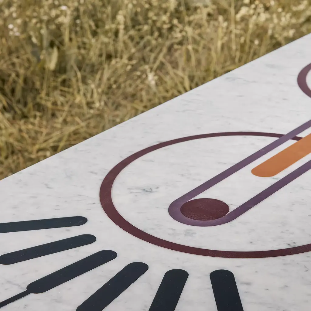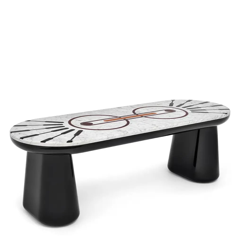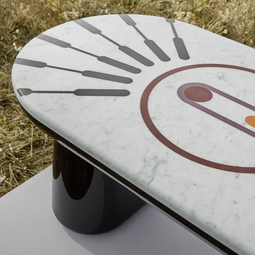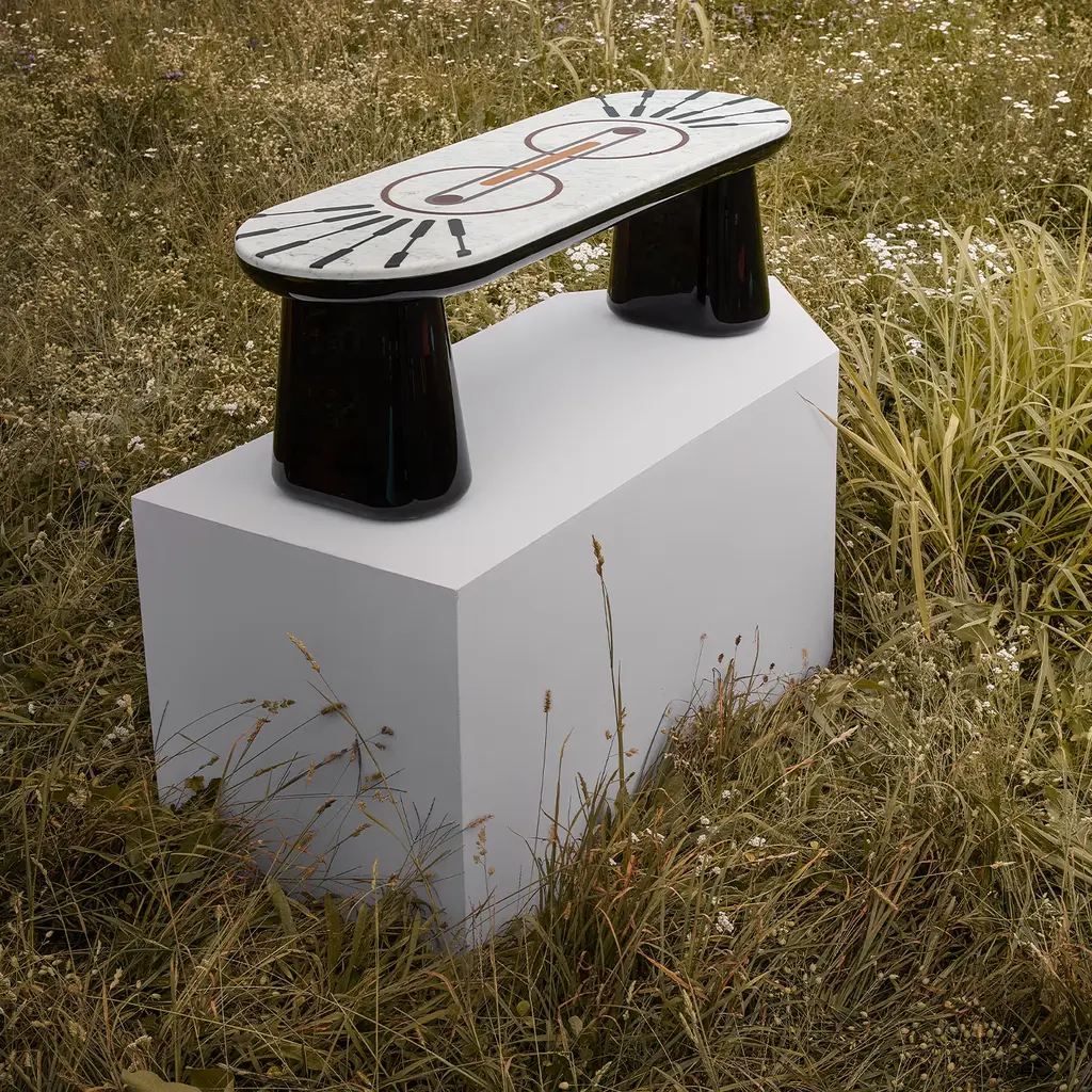 Ione was born from the encounter between smooth shapes and sophisticated graphic carvings. Circles, lines and orbits blended together give life to a marble and resin bench that seems to come from another world.