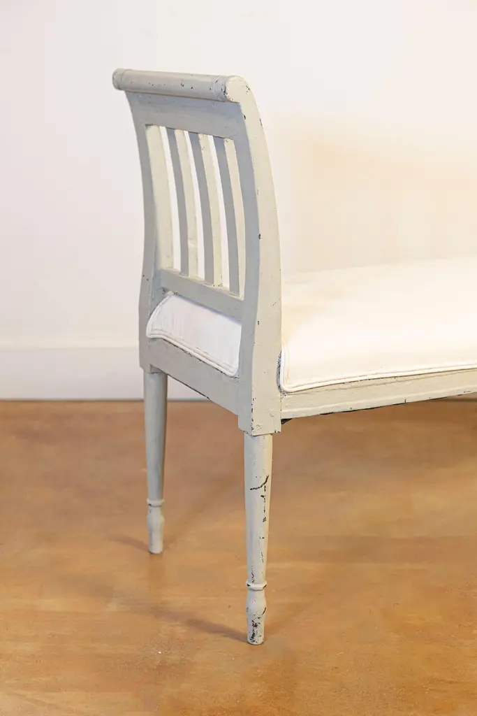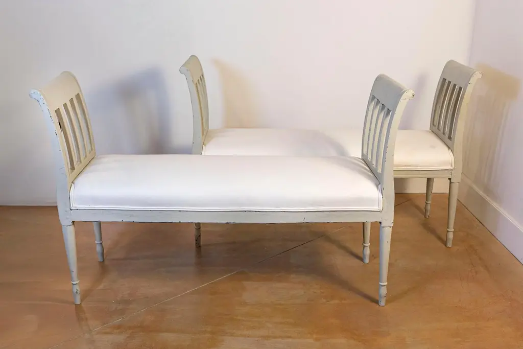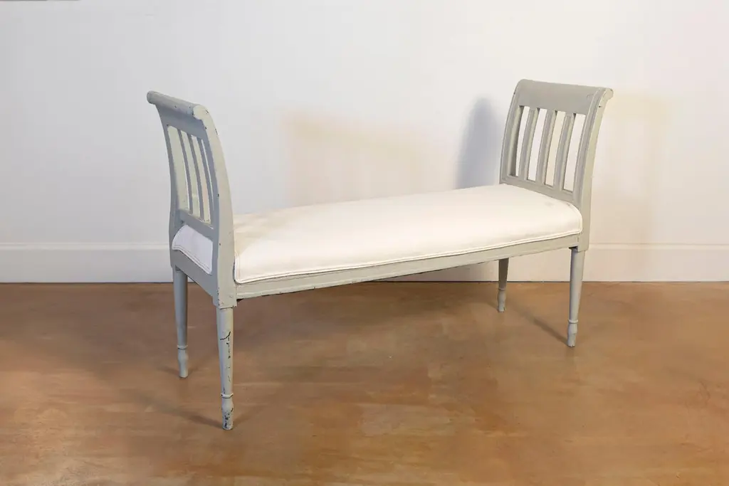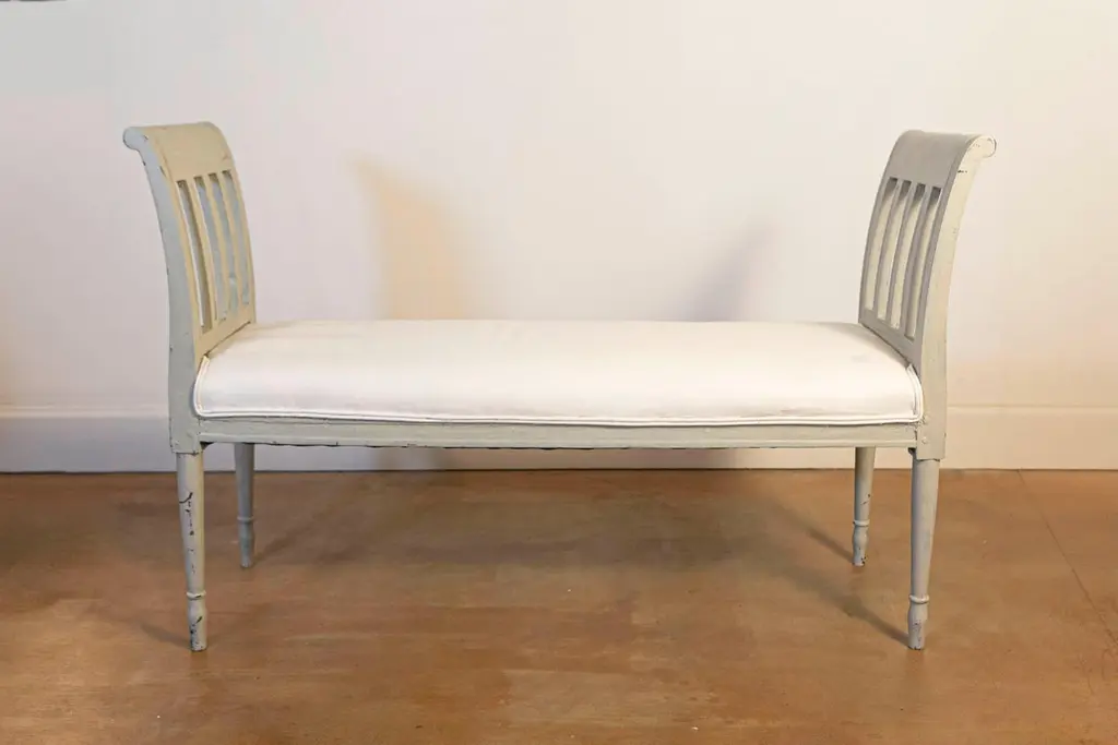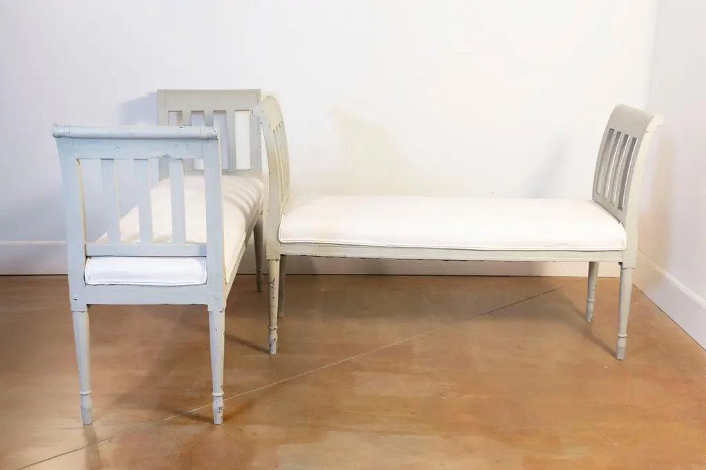 Pair of Italian painted 19th century benches. Price is for each bench, circa 1890.Price: $3,950 (Each)An Italian painted wood bench from the late 19th century, with out-scrolling arms, cylindrical legs and new upholstery. We have two benches available, priced and sold individually. Born in Italy during the later years of the 19th century, each bench features a simple rectangular seat newly recovered with double welt fabric, flanked with two delicately out-scrolling arms. The ensemble is raised on four cylindrical tapering legs. Painted in a soft color complimenting the classical lines beautifully, these Italian benches circa 1890 will bring a touch of elegance to any home. They are priced $3,950 each.