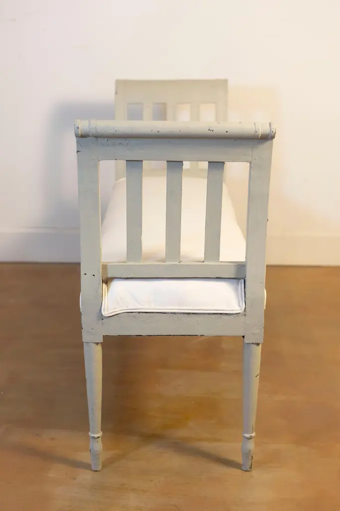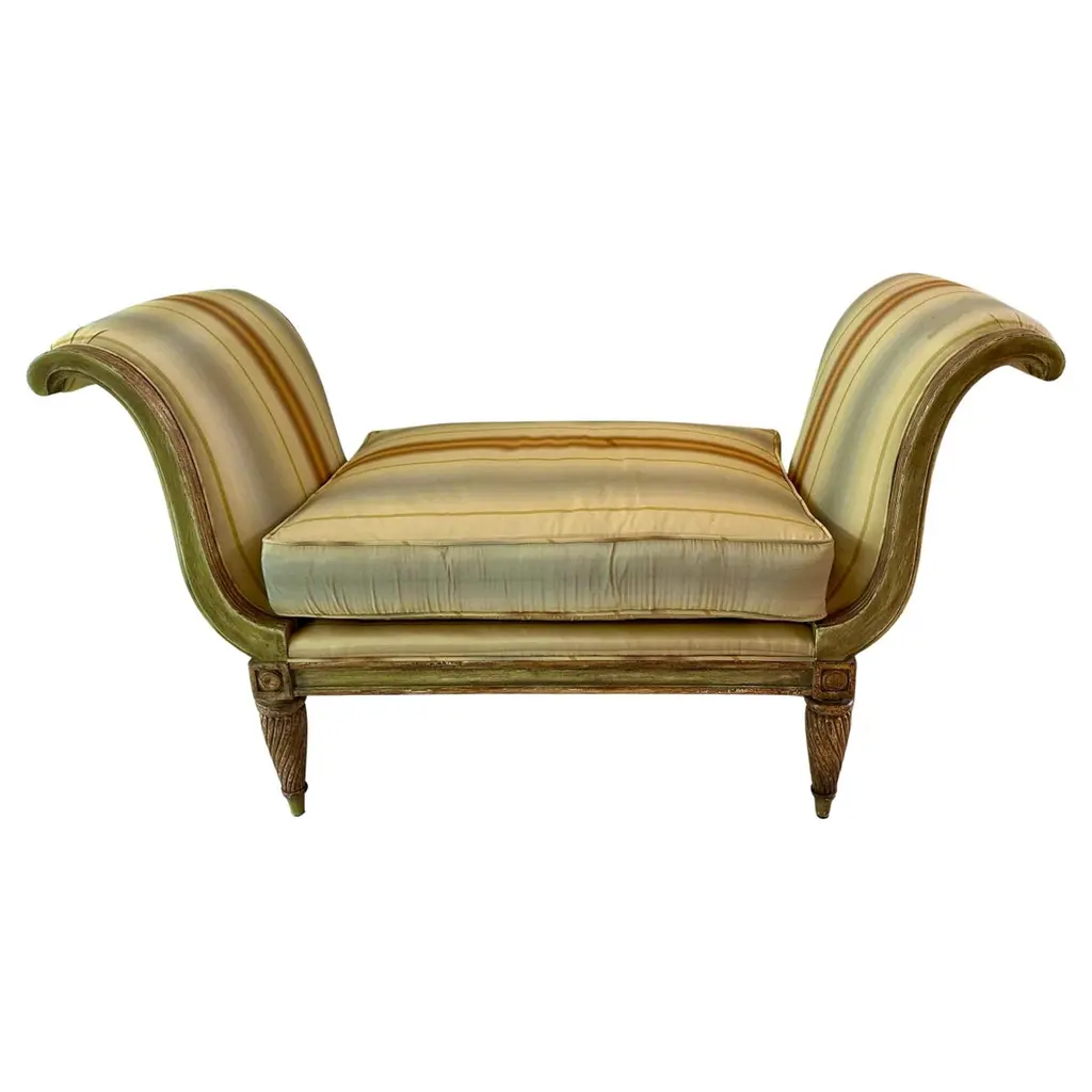 Italian 1890s Painted Wood Classical Bench With Scrolling Arms And Upholstery