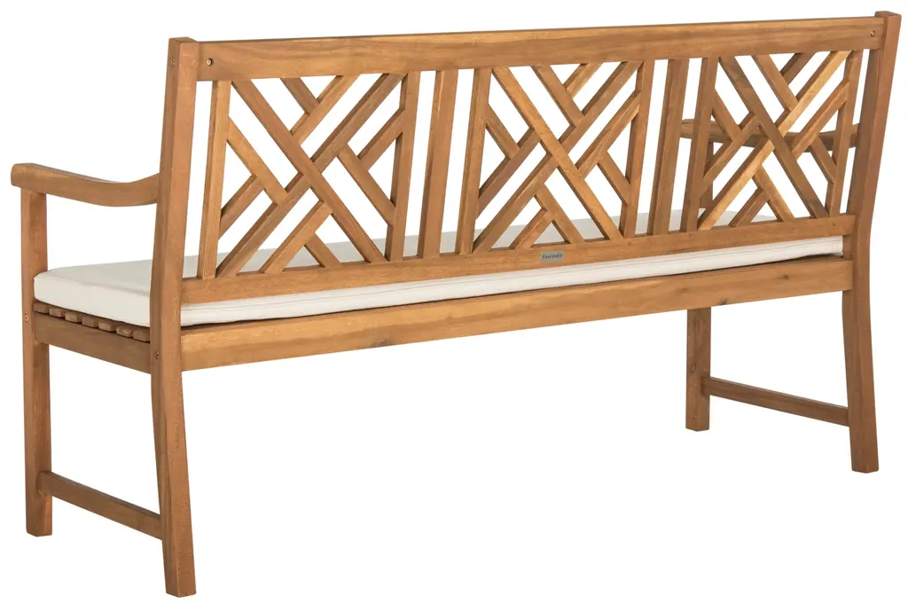 Inspired by furnishings in the regal gardens that surround Newport’s Gilded Age mansions, this 3 seat outdoor bench is a classic. it's traditional geometric design is highlighted by a natural finish and welco beige cushion. Store outdoor furniture indoors or cover well when not in use. Remove wooden furniture from standing water. Dust regularly with small brush or vacuum. Spills should be taken care of immediately before they harden or stain with a slightly dampened sponge. Do not use bleach solutions. Some assembly required.
