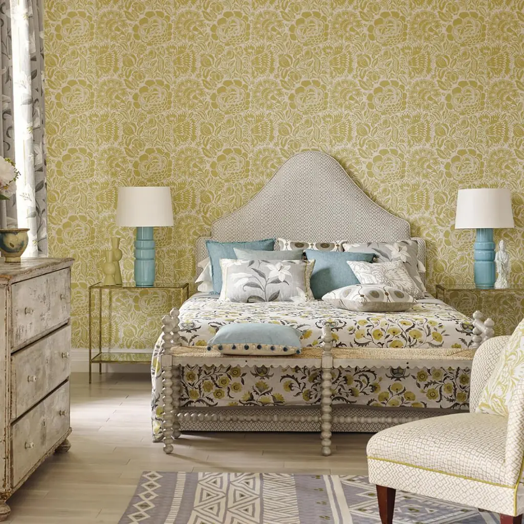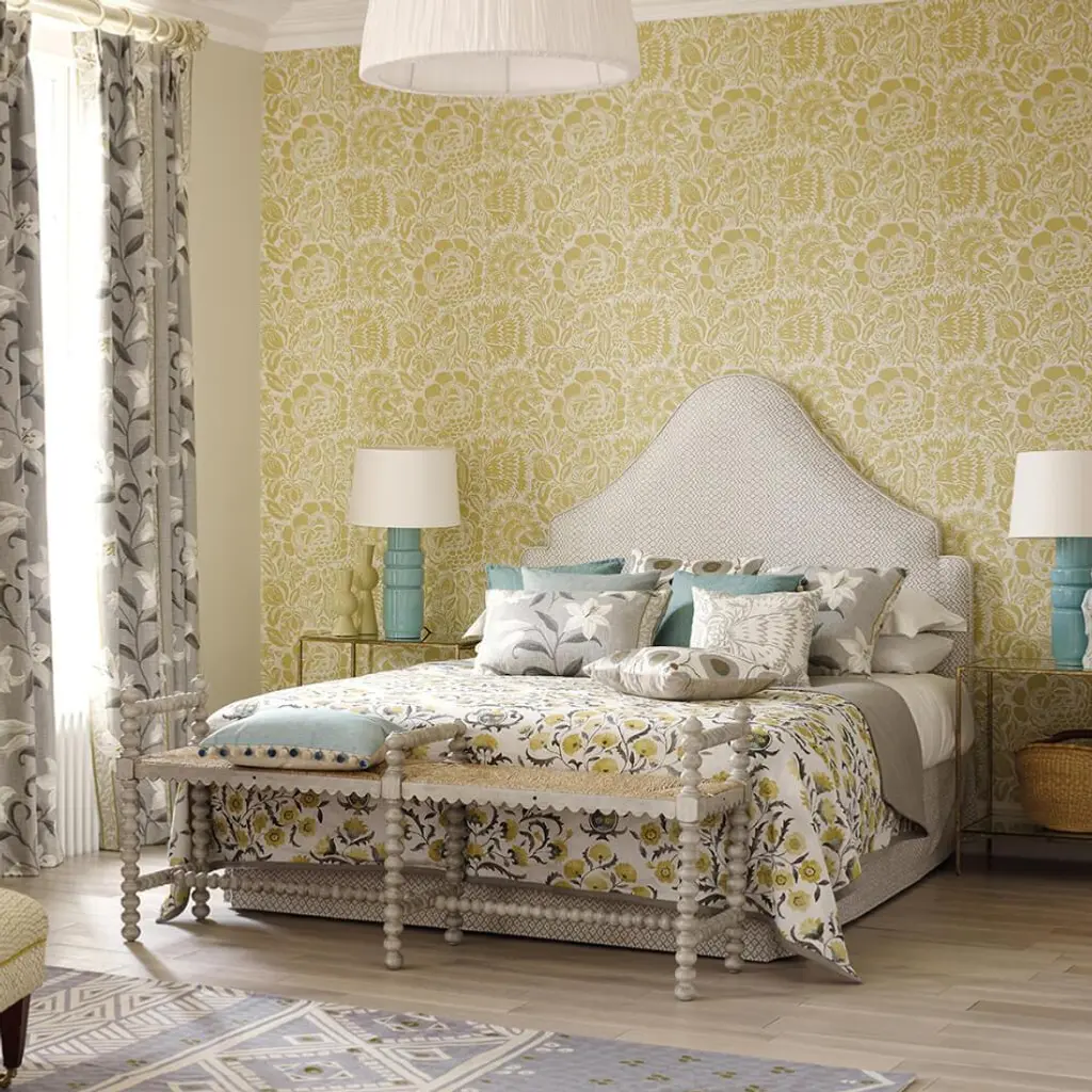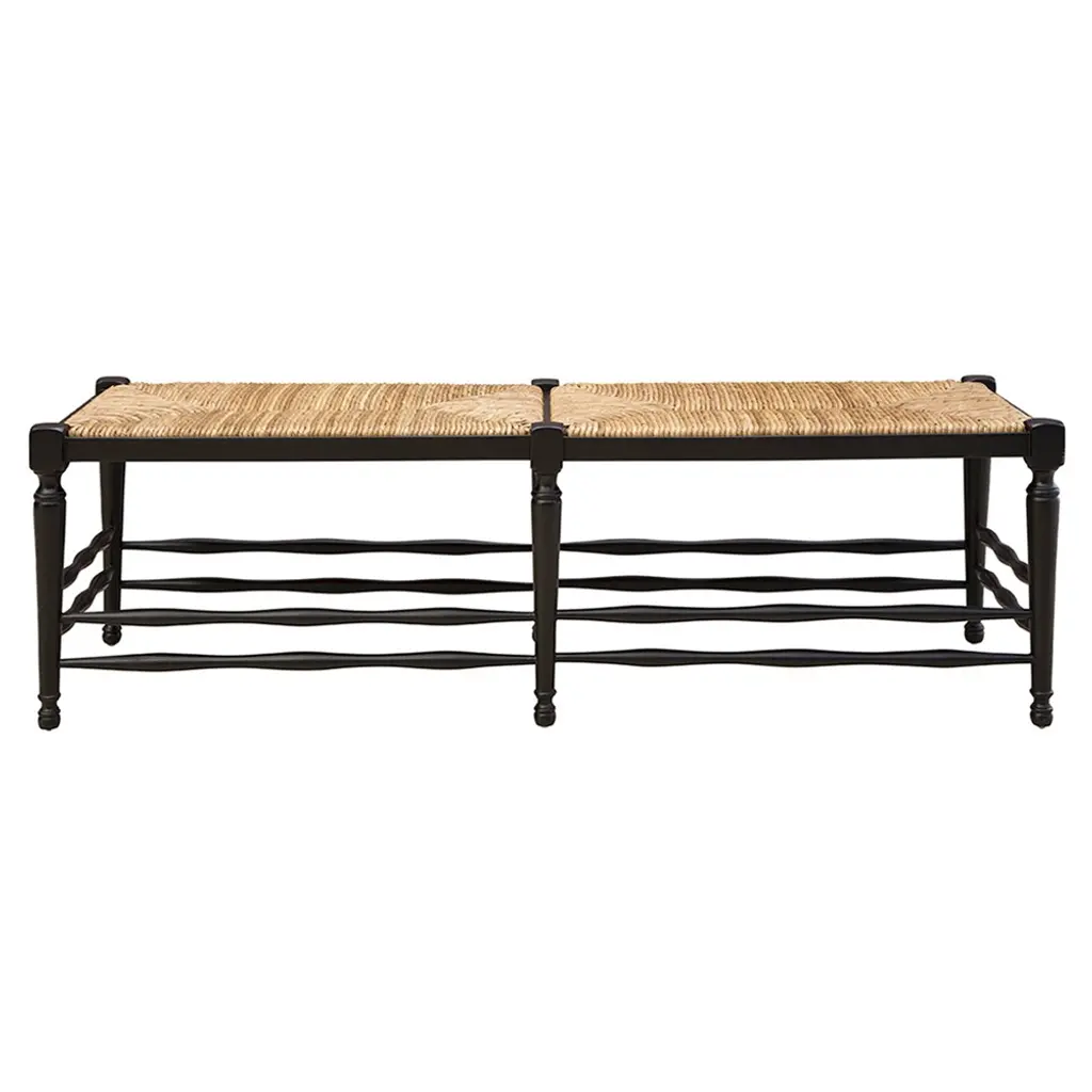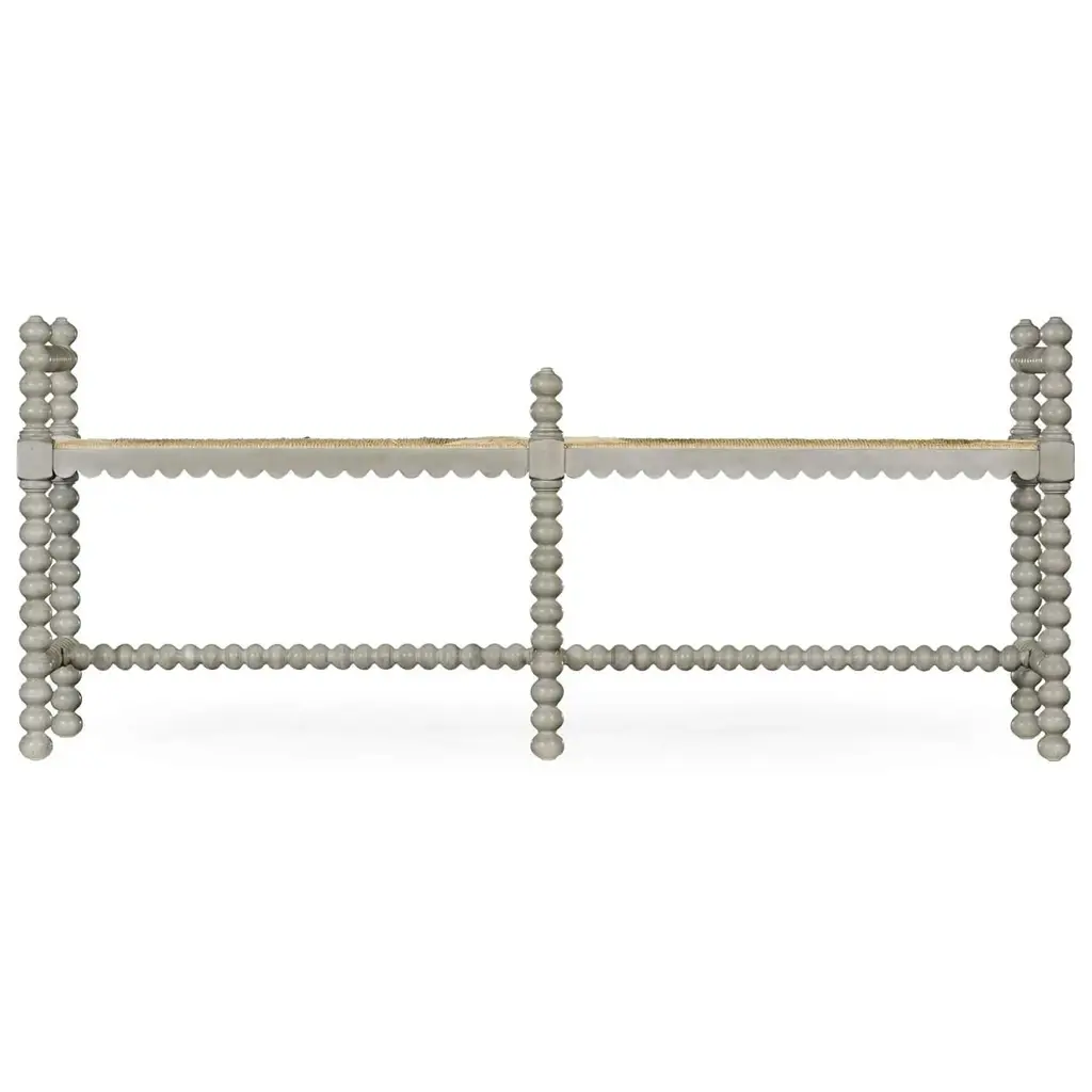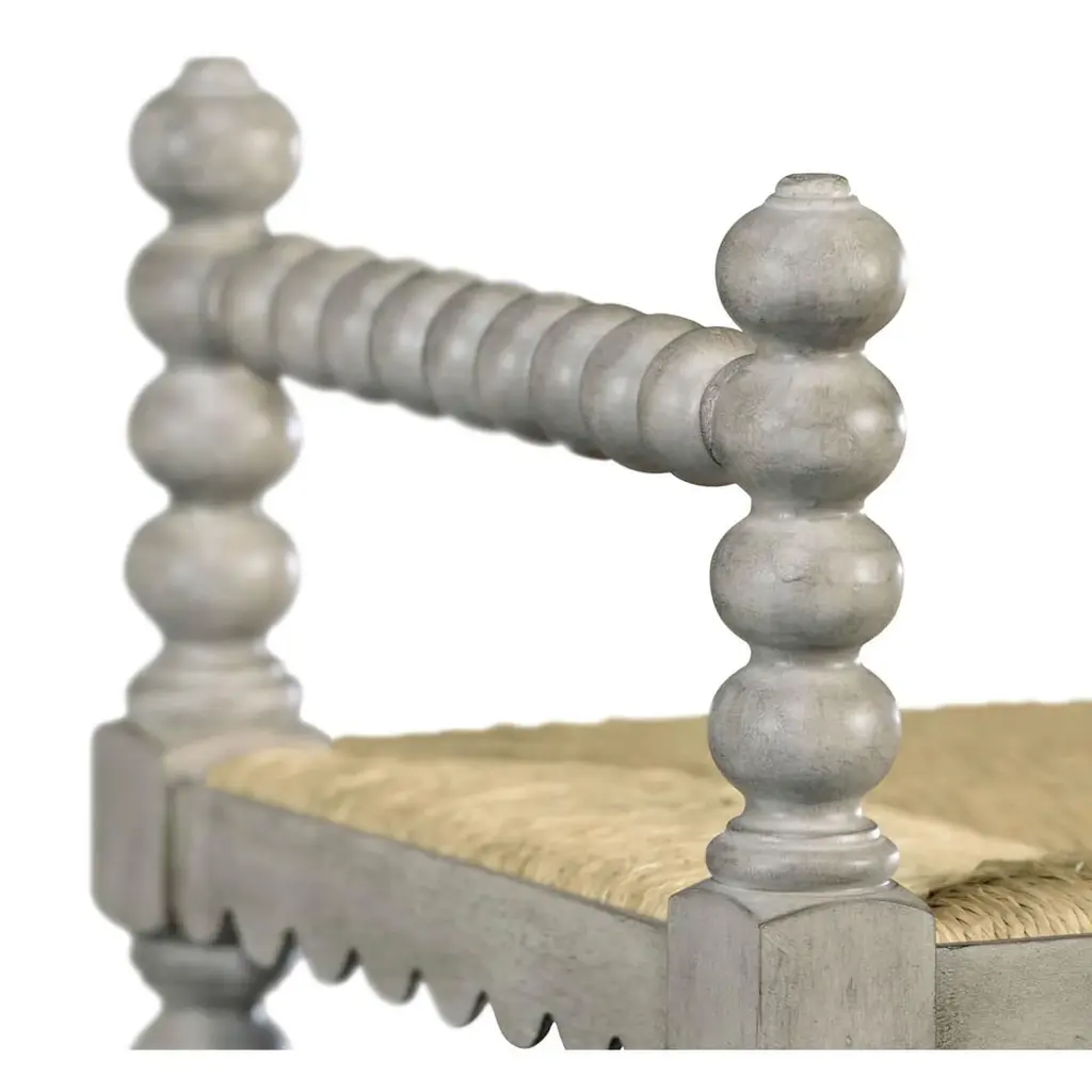 A modern Jacobean double bench constructed of acacia and finished in pale grey paint with a fine rush seat is perfect at the foot of a bed. Dimensions: 60" W x 16" D x 25.25" H