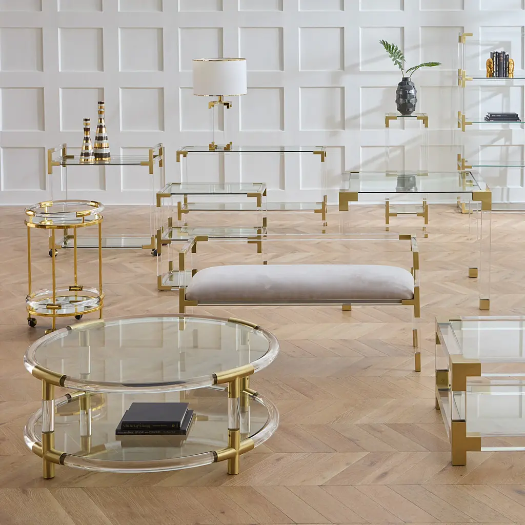 Clearly Cool. A luxe, clear framework with brushed brass corners and a plush grey velvet seat crank up the glamour. The perfect blend of simplicity and glamour, modern and traditional, our Jacques Bench is fab in your foyer or trés chic at the foot of your bed.