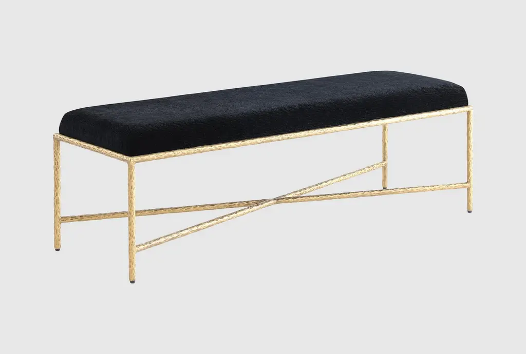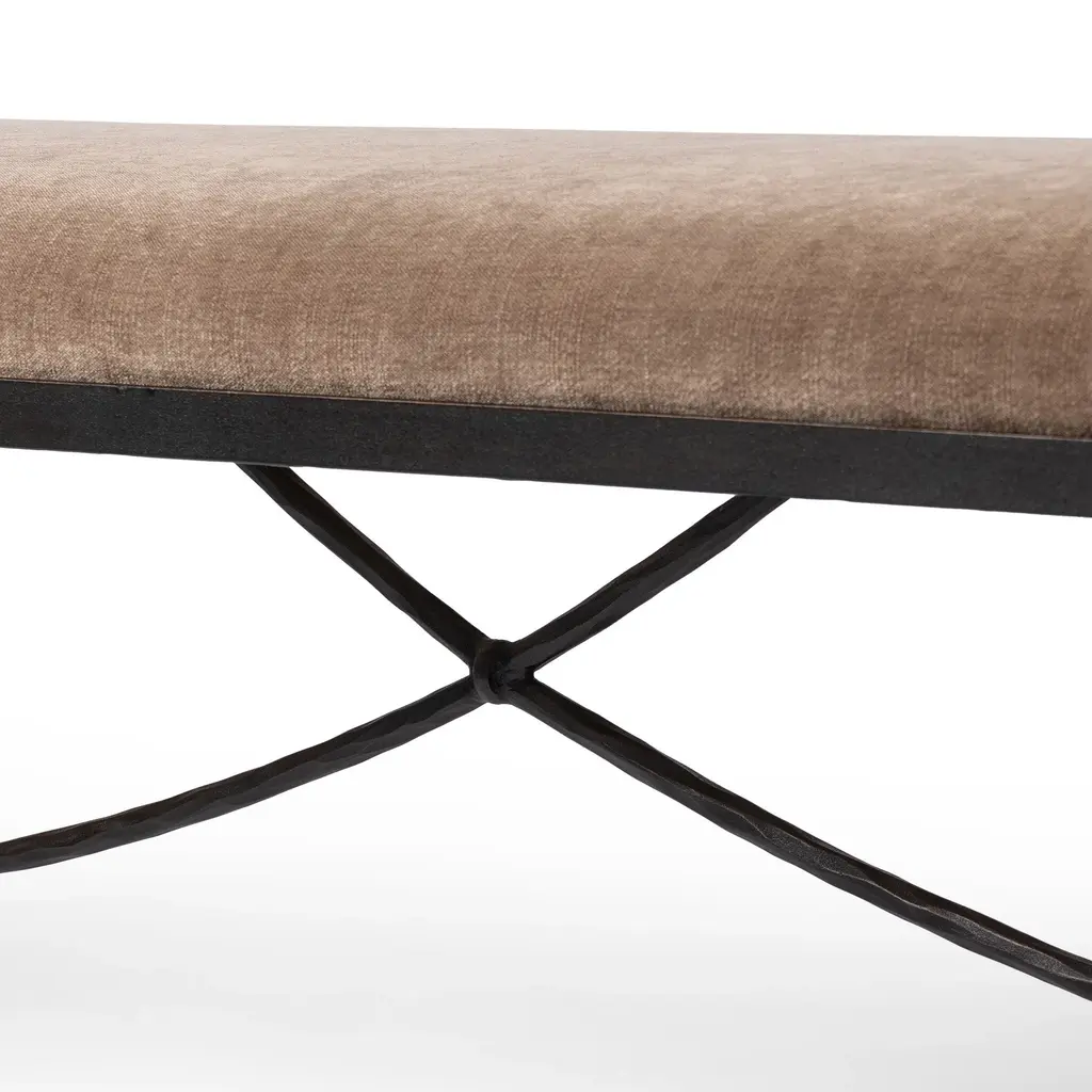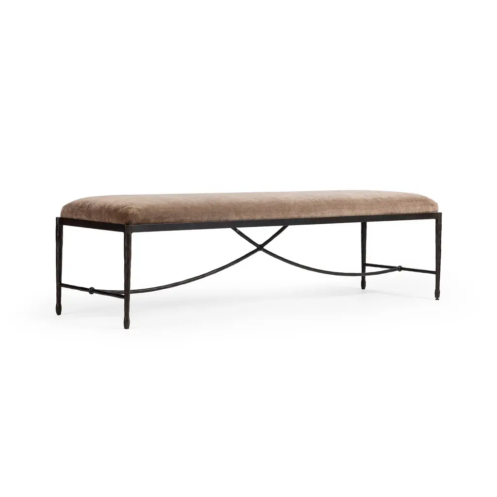 Enhance your space with the luxurious Jade Accent Bench from Four Hands. Featuring an Art Deco-inspired design with a bronzed hammered iron base, this bench exudes sophistication. The velvety earth tone seat adds elegance and versatility, making it perfect for the bedroom, entryway, or living room. Elevate your decor with this stylish and functional piece. Highlights