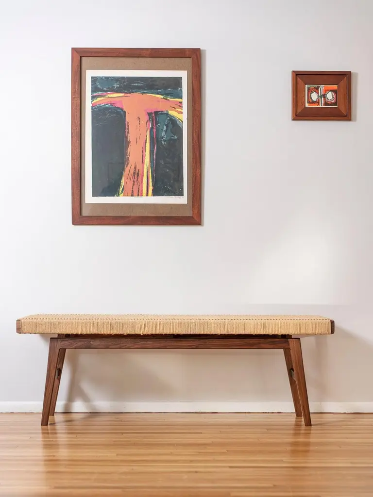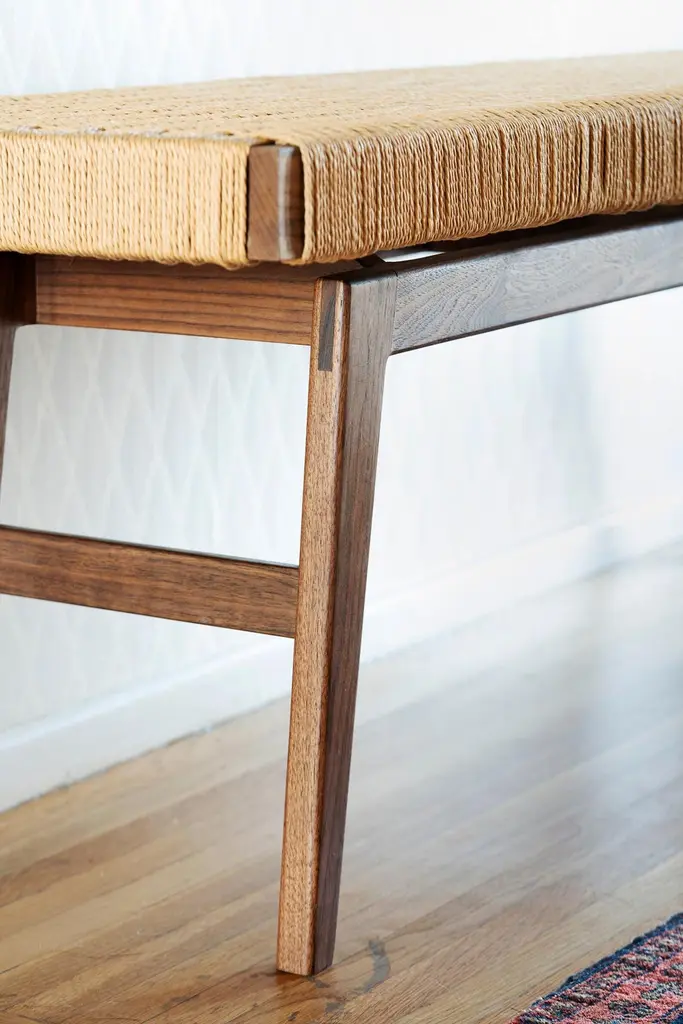 The Jana entry bench is an original design, rooted in my love of all things modern, mid century, and Scandinavian. It's lovingly hand-built by me and my team from solid walnut (other woods available upon request) and Danish cord. It's an expression of pure love for form, craft, beauty, family, sitting, relaxing, tying shoes, and hanging out. The Jana entry bench, for all of your comings and goings. Dimensions are 56" long by 15" deep x 19" tall.