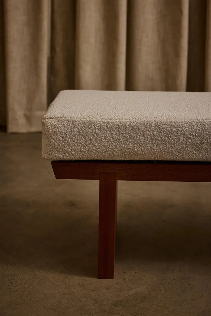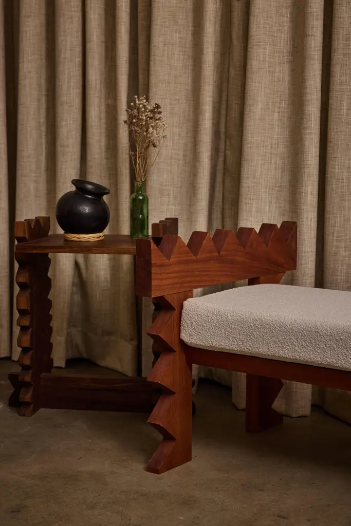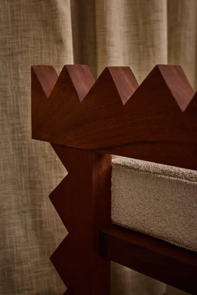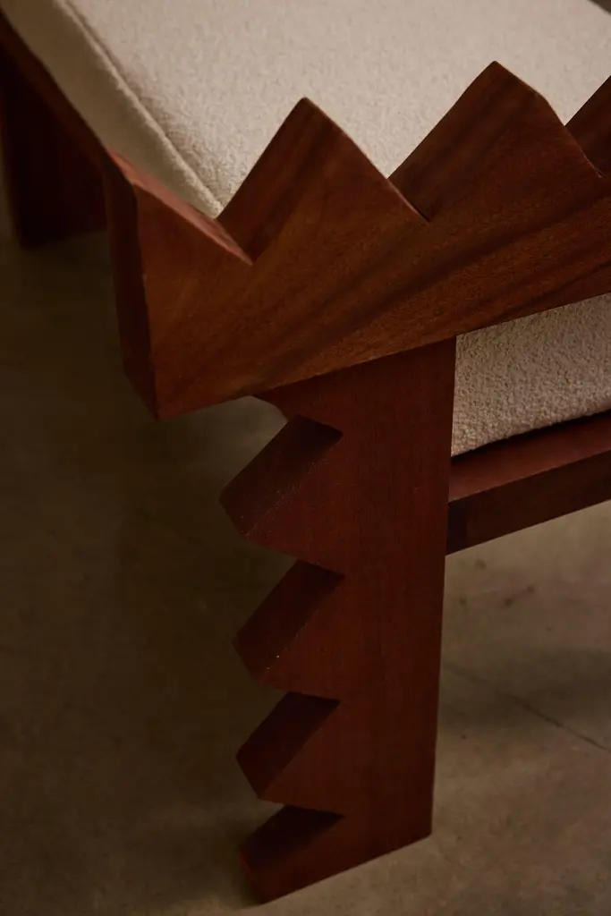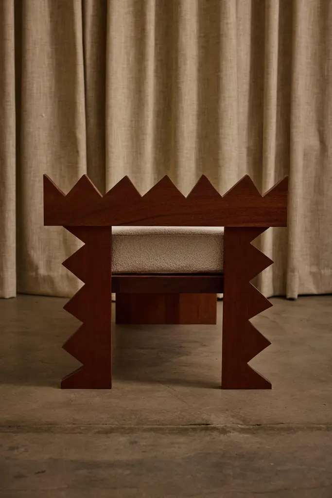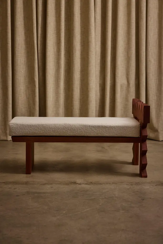 Jura Bench by Ah Um Design StudioHandmadeDimensions: D 106.6 x W 63.5 x H 55.9 cm.Materials: Mahogany wood, oil finish, white bouclé.Available in other upholstery and finish options. Please contact us.Hand-carved wood, an angular design, and a lush boucle come together for this sculptural bench. Crafted from solid mahogany this piece brings texture and character to any room. Made by hand in Los Angeles California.Ah Um Design Studio, founded in 2023, is the furniture project of Zack Nestel-Patt, designed and built in Los Angeles, California. Taking from sculptural practice, Ah Um makes furniture that is clearly hand-built, striving for an aesthetic that resonates with warmth and reflects the human hand that crafted it.