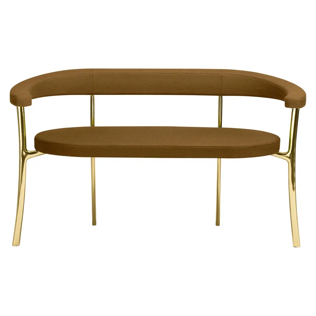 Thus the elliptical section of the leg emphasizes its elegant and solid supporting element. The padded seat, simple and closed, suggests possible variations of shapes, dimensions and materials in relation to use and comfort. Finally, the back formally released from the seat, allows you to free its nature of element strongly characterizing the seat: it can then be dilated or enveloping, high or low, rigid or soft, exaggerated or contained, allowing even in this case the freest combination of variations.Additional Information:Material: Brass and red fabricFinish: Polished brassDimensions: W 120 x D 53 x H 66 cmAvailable in other upholstery options: Natural leather, velvet, nappa leather, nabuck leatherAvailable in other finish options: Brown burnished brass, satin brass, light burnished brass, dark burnished brass, black gold