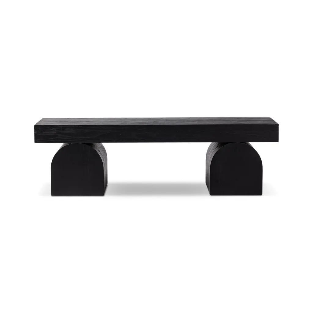 A study in shape. Handcrafted from solid reclaimed elm with visible knots and graining, chunky arched legs support clean bench-style seating. An ideal pop of modernity in the entryway and beyond. Features
