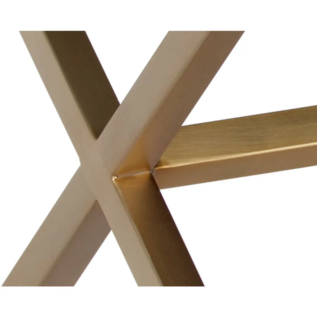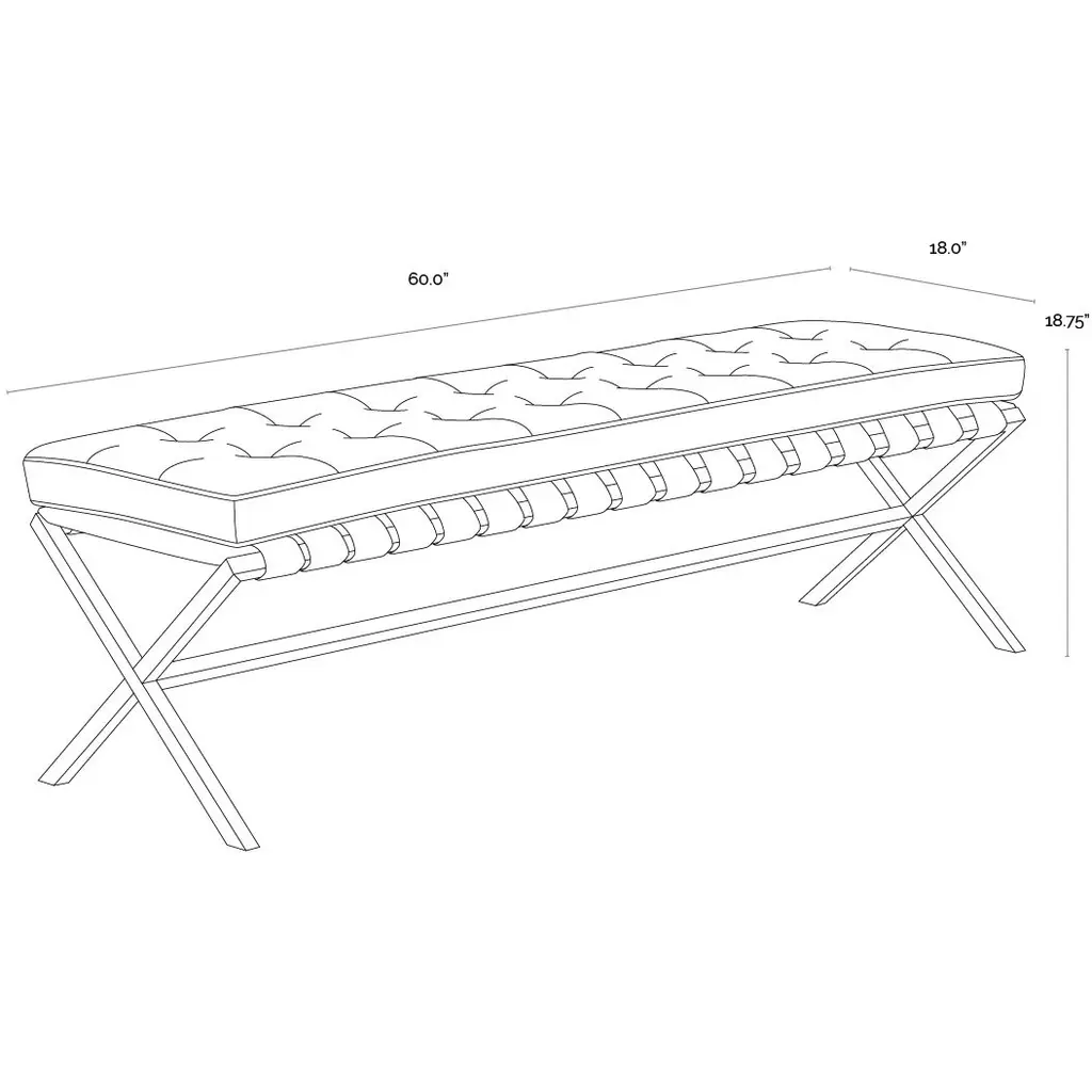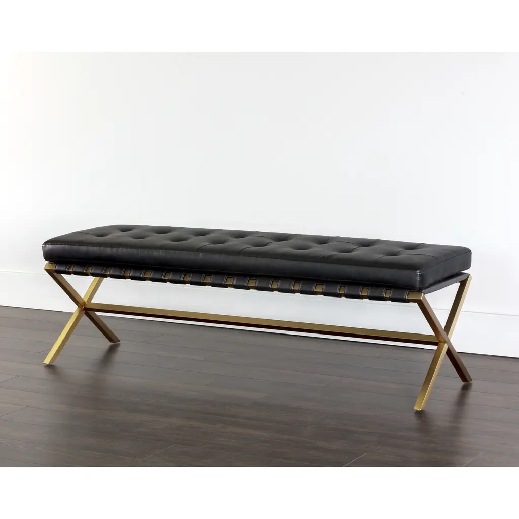 This transitional bench offers comfort and style to living and lounge spaces, bedrooms and more. Features a trestle style frame with a striking brushed gold finish and a button tufted seat. Stocked in bravo black and cream faux leather. Handle With Care: This design has been crafted with faux leather. Faux leather is manufactured to reflect the natural characteristics of leather as such, colour variations, markings, wrinkles, grooves, and light scratches are appreciated characteristics. No two pieces will be alike. Visit our Product Care page for more information on how to ensure the lasting beauty of this piece.
