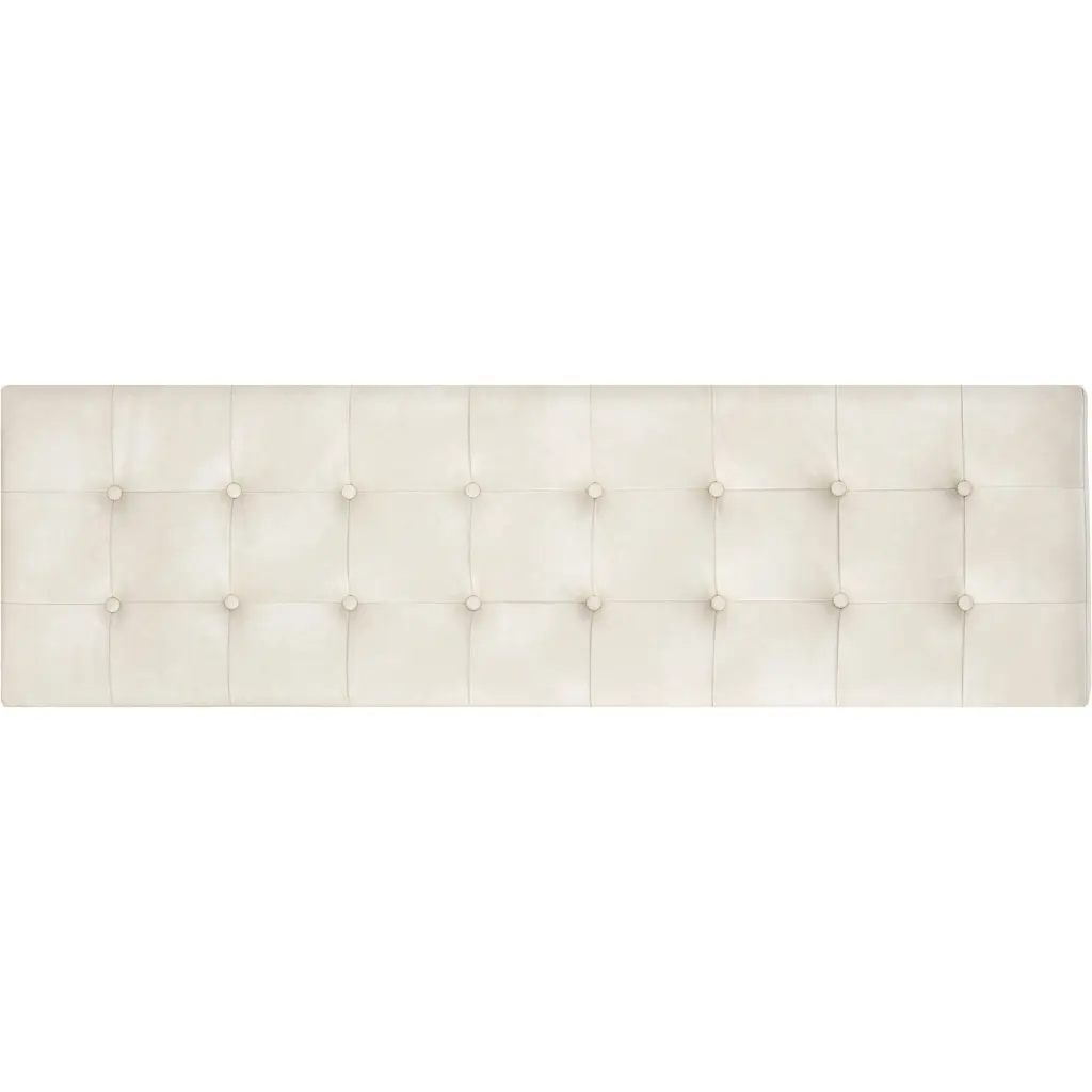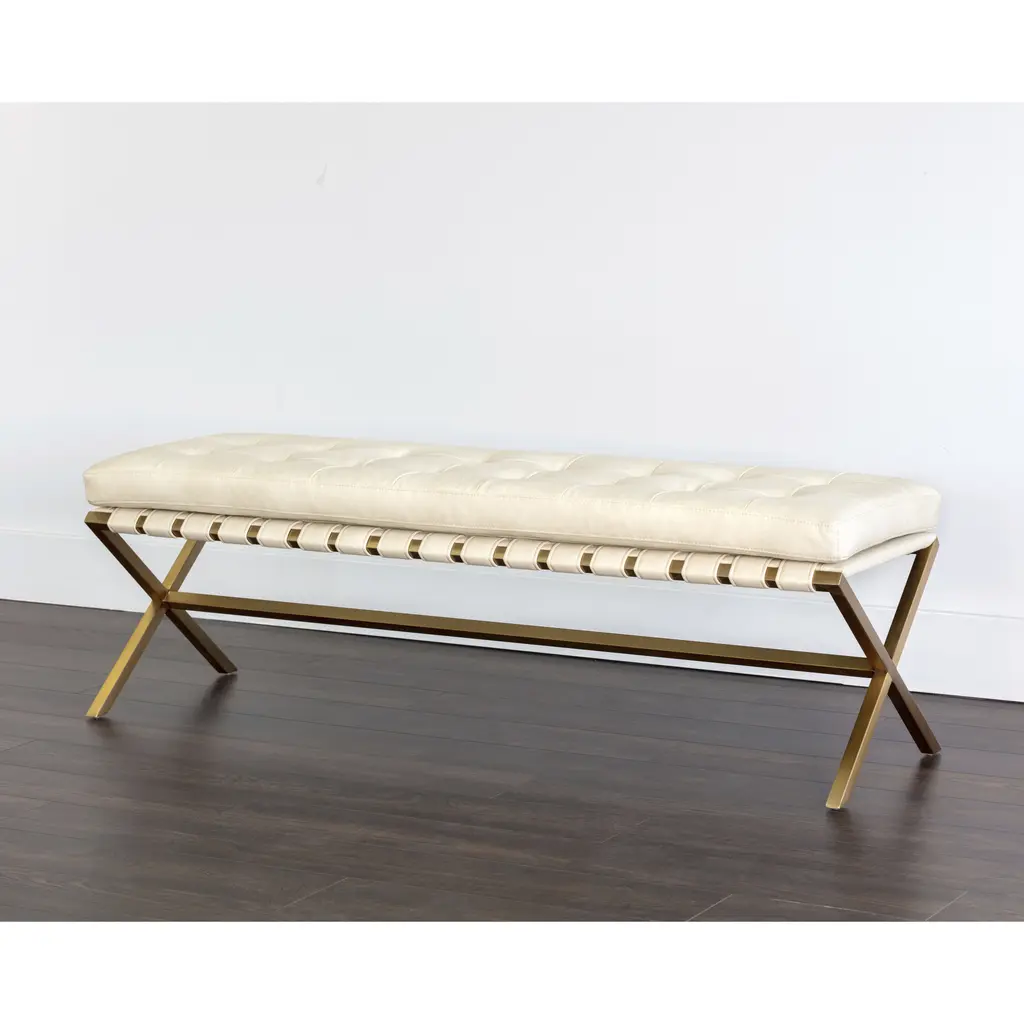 This transitional bench comfort and style to living and lounge spaces, bedrooms and more. Features a trestle style frame with a striking brushed gold finish and a button tufted seat. Stocked in bravo black and cream faux leather. Handle With Care: This design has been crafted with faux leather. Faux leather is manufactured to reflect the natural characteristics of leather as such, colour variations, markings, wrinkles, grooves, and light scratches are appreciated characteristics. No two pieces will be alike. Visit our Product Care page for more information on how to ensure the lasting beauty of this piece.