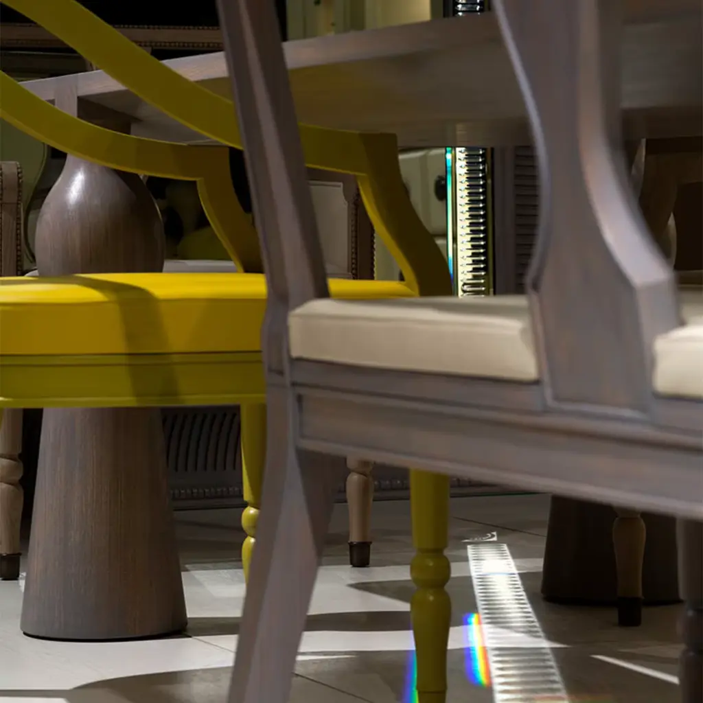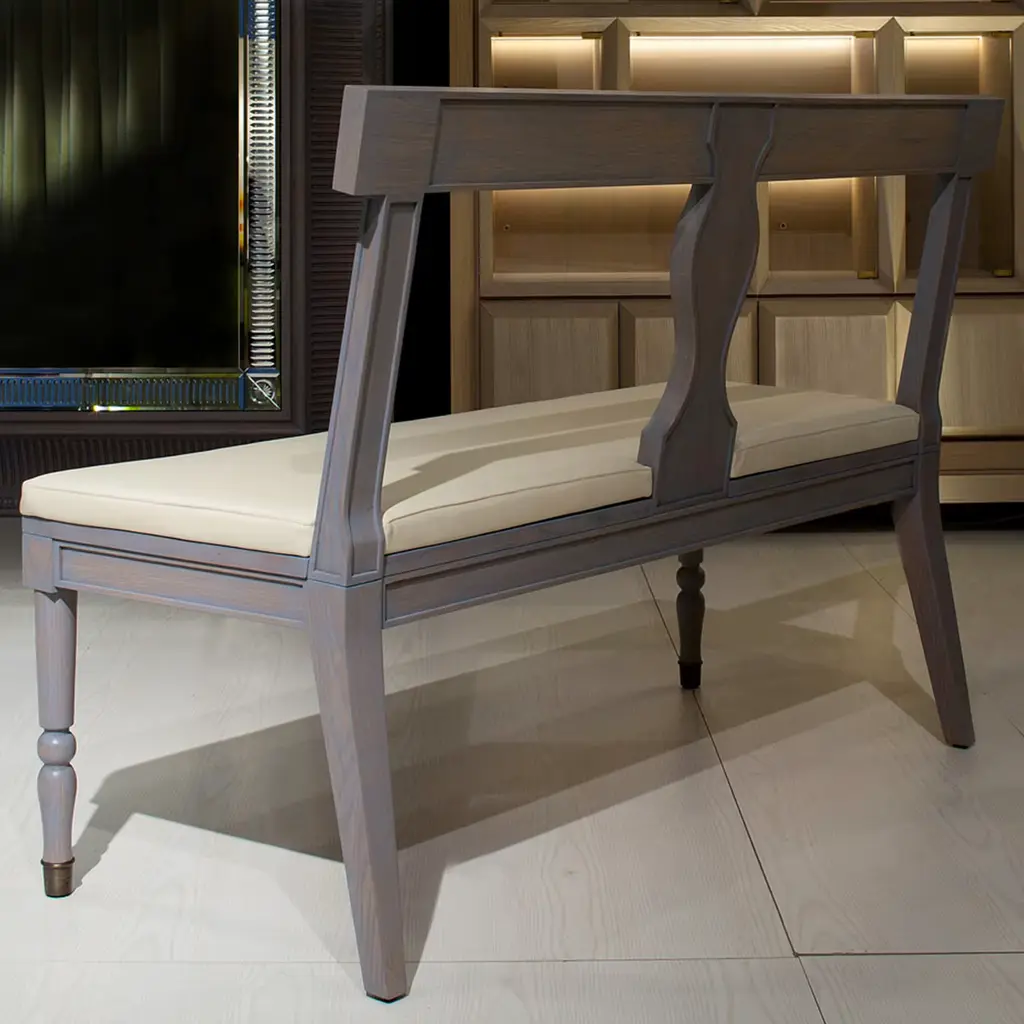 Following the Neoclassical style touching the whole collection by Archer Humphryes Architects is the Kings bench. Rigorous lines and small detailing define it: from the carved wood in the middle of the seatback to brass tips covering its front legs. The selection of a natural-oak finish and a leather upholstery enhances the bench’s shape, as well as highlighting the contrast between its classic side and the stylized touch of its designer.