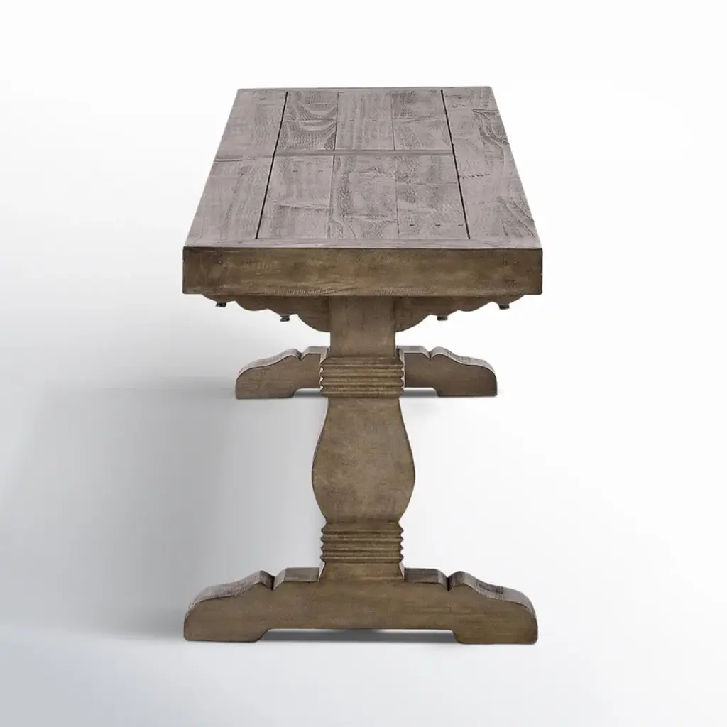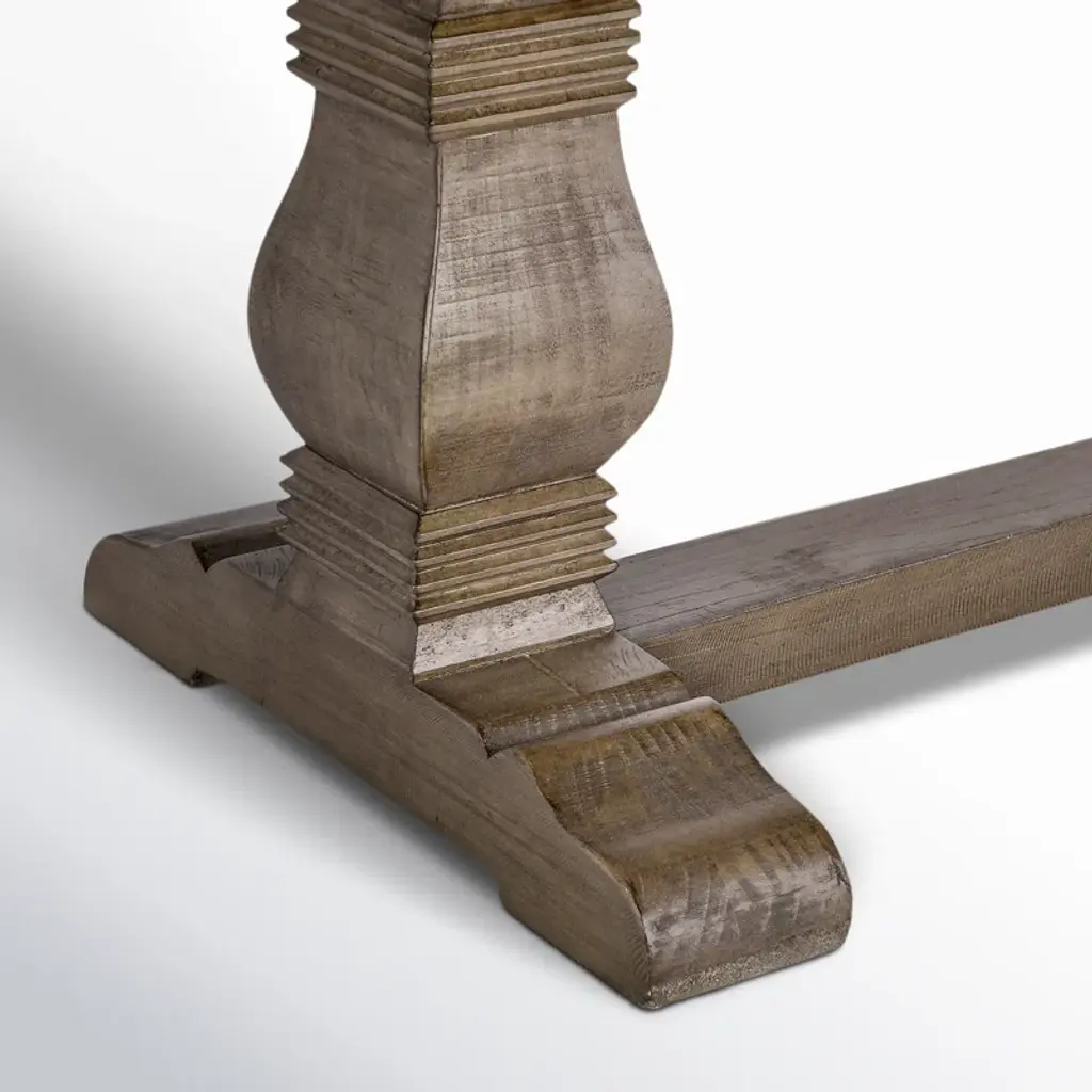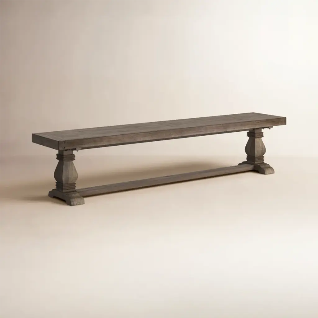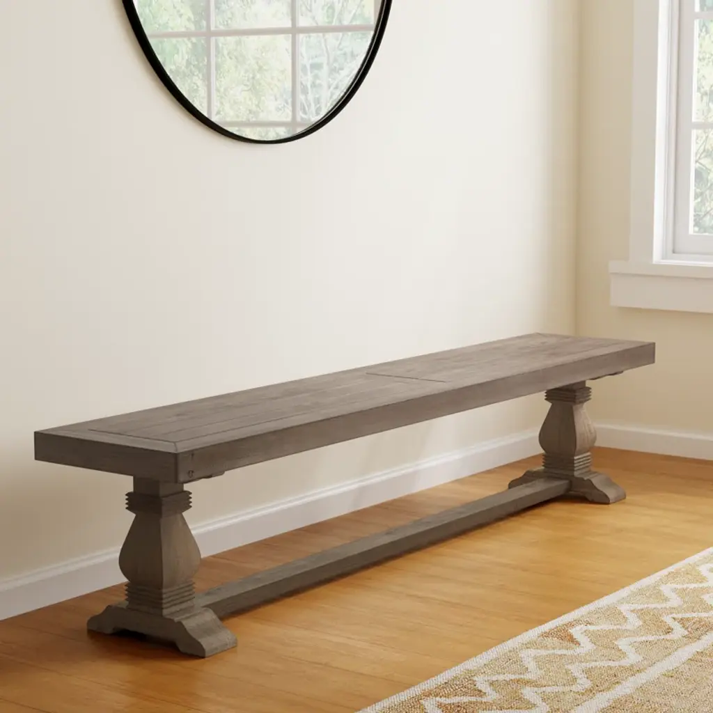 We love the versatility of a bench. Whether in an entryway as a place to tie up your shoes or alongside the table for dinner party seating, it’s a win-win. This one is crafted from solid wood in a medium hue that’s been distressed to highlight its natural grain variation (knots and all). The base has accordion-inspired detailing and turned legs – higher quality detailing that adds visual dimension and interest.