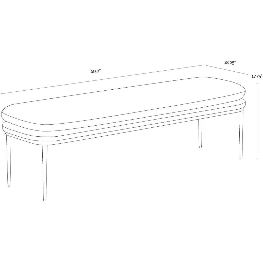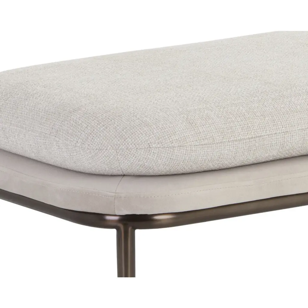 Rejuvenate any space with this contemporary bench that features a sleek design. Upholstered in chacha cream and meg taupe fabrics with a double cushioned seat. Completed with a dark bronze stainless steel base. Also available in a chacha grey and antonio charcoal fabric combination with a gunmetal stainless steel base. Coordinating stool also available.