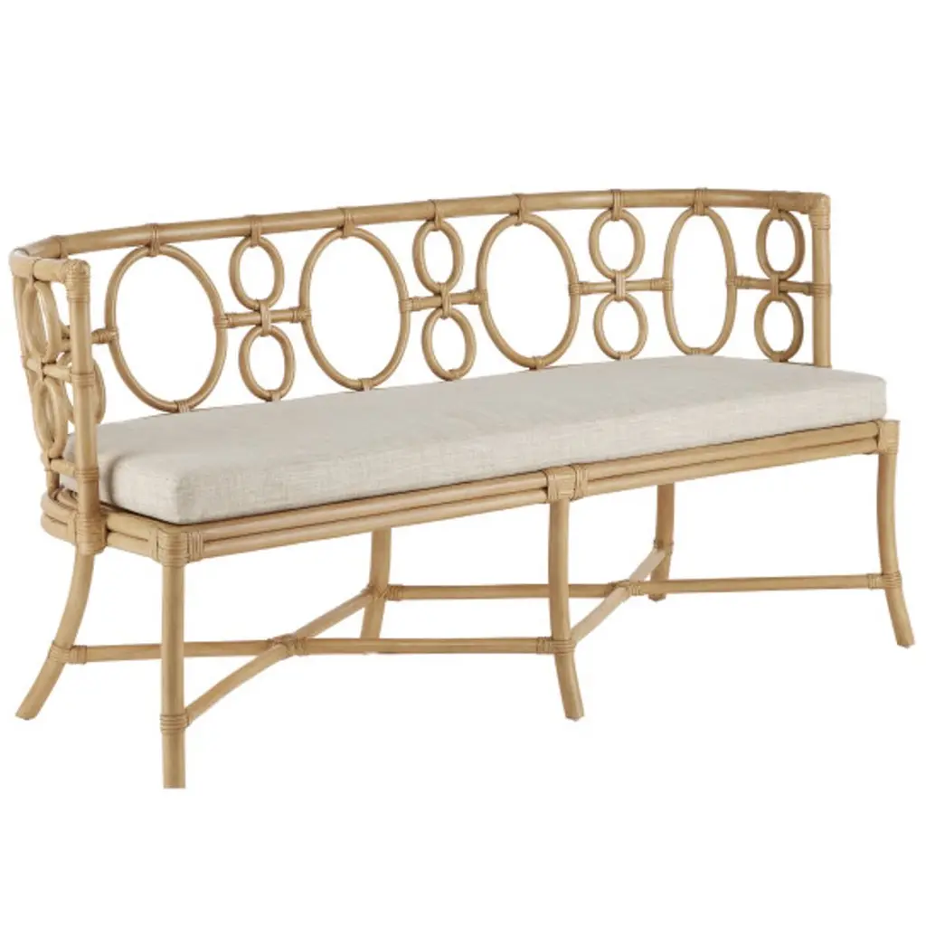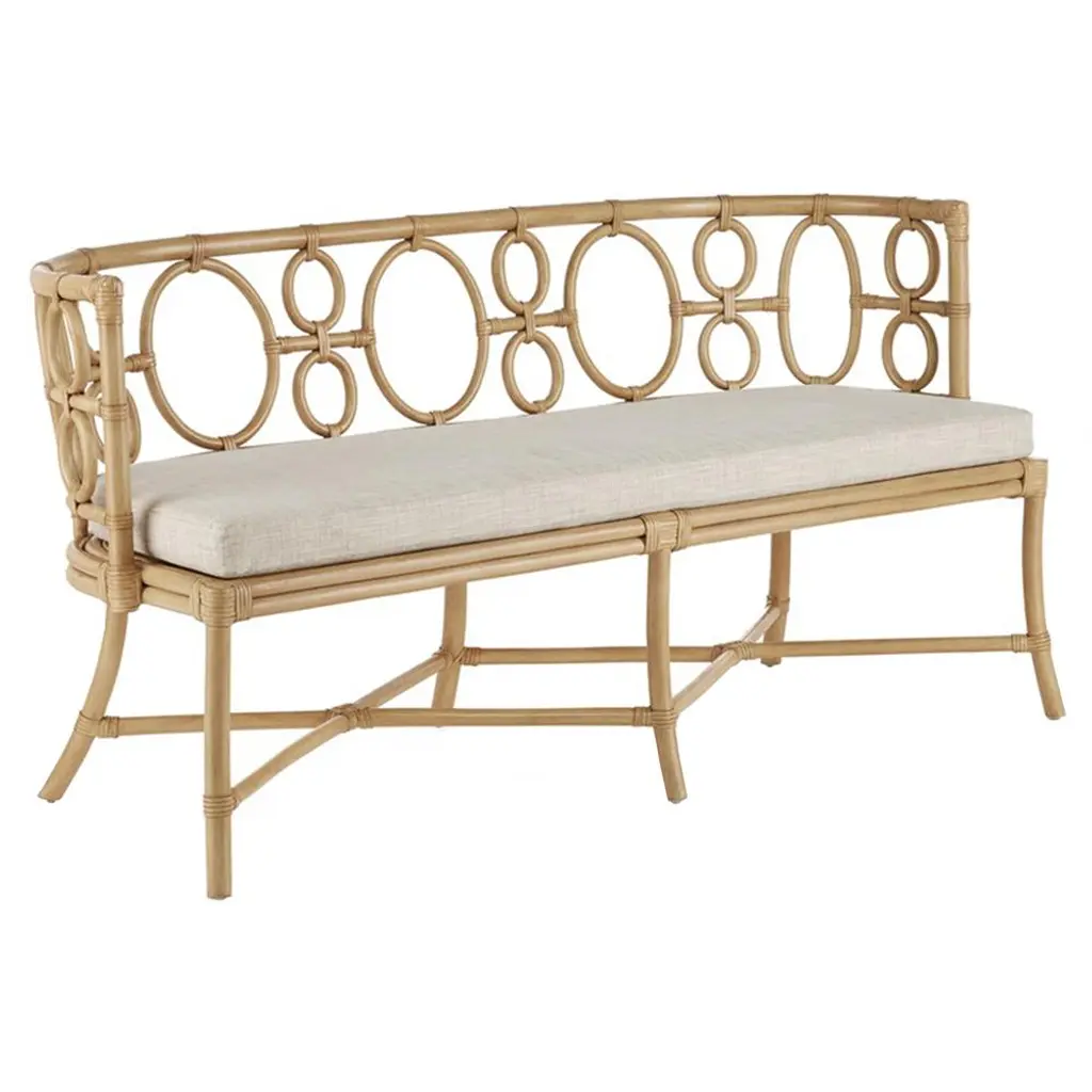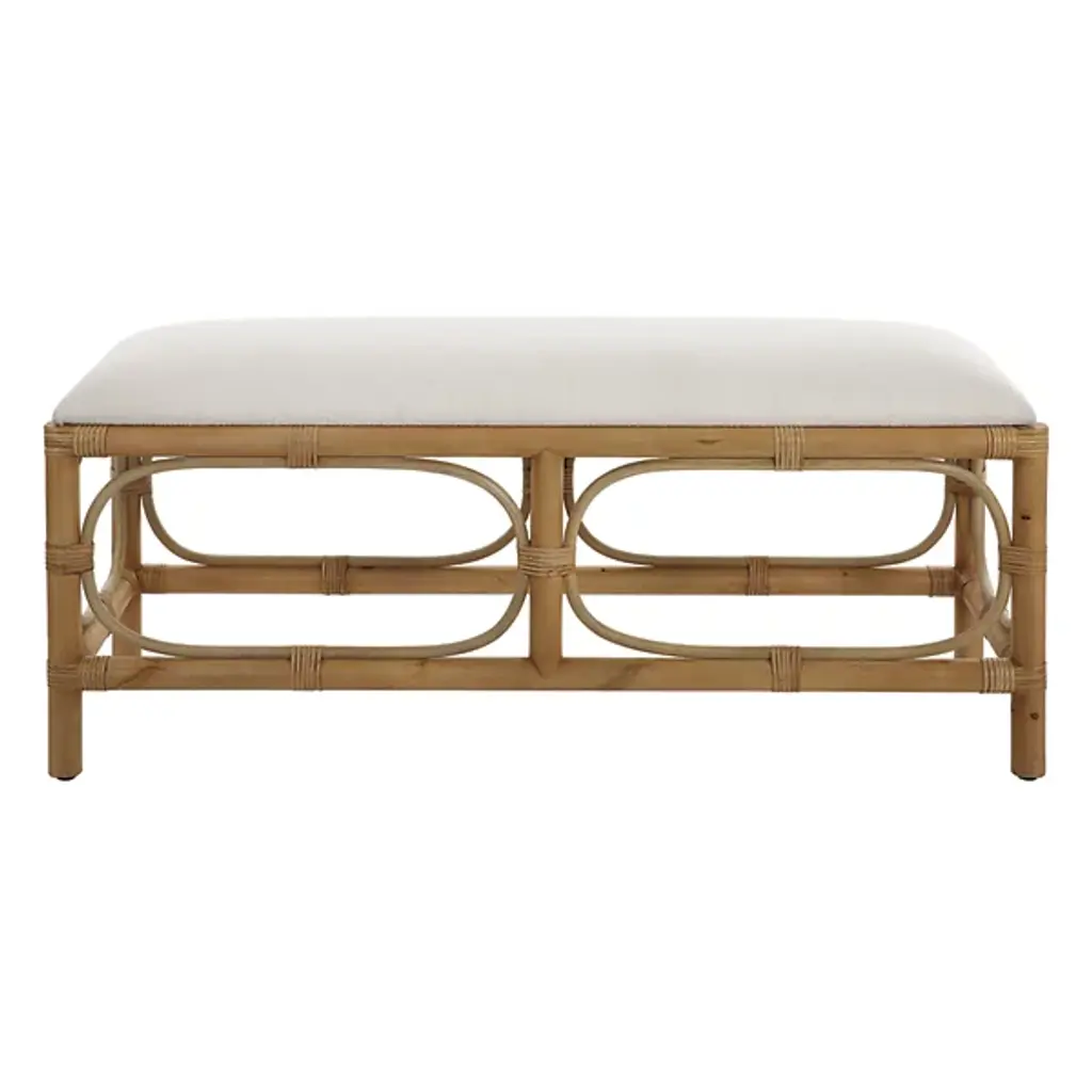 The Laguna Bench from Uttermost features quality materials that meet a one-of-a-kind high-style design. This refreshing coastal accent boasts a crisp white textured fabric gracefully draped over a naturally finished solid wood base with charming rattan-wrapped accents. Perfectly suited at the foot of a bed or as additional family room seating, this bench exudes versatility and coastal charm, adding a touch of elegance to any space.