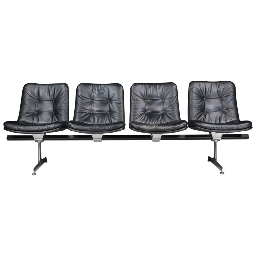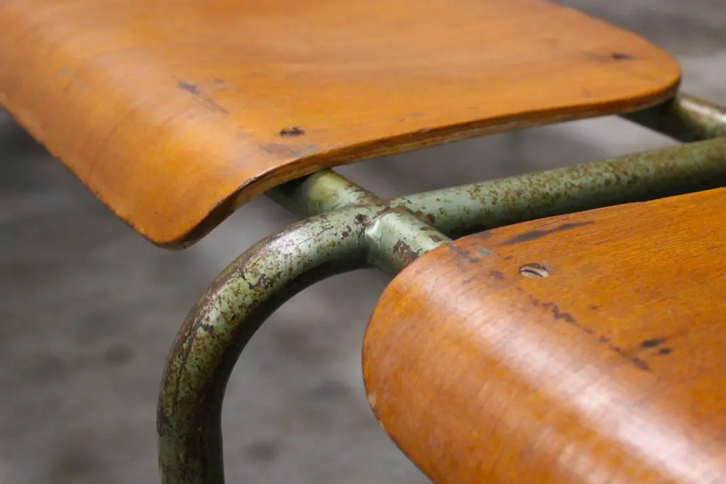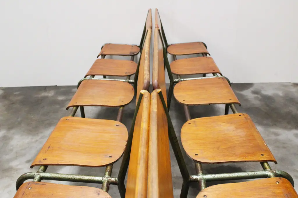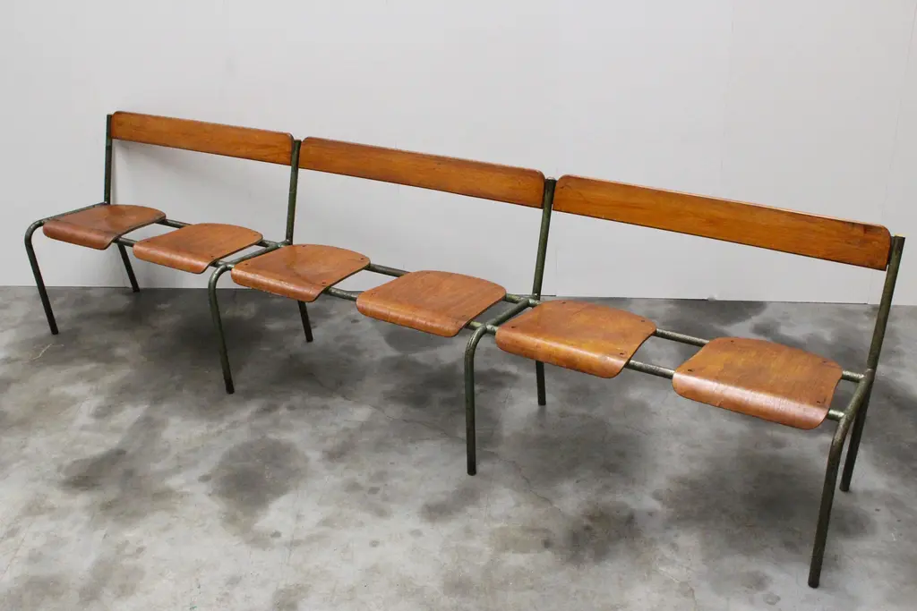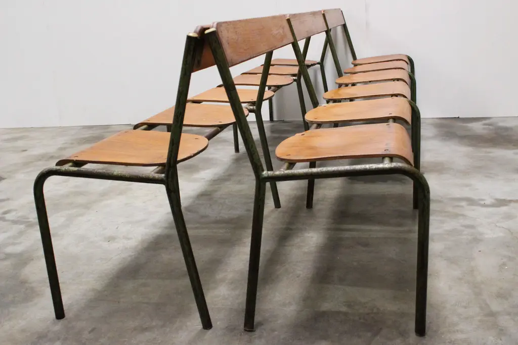 - Industrial schoolbenches manufactured by the French company Mullca in the 1950s - These benches have 6 seats - Warm wood tone and a patina - The width of each seat is around 35 x 35 cm I have official proof of authenticity such as vintage catalogs, designer records, or other literature sources and take full responsibility for any authenticity issues arising from misattribution