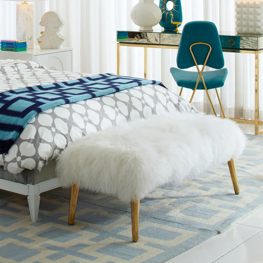 Posh Perch. A plush Mongolian lamb bench with brass legs for a surprising and glamorous twist. It's the perfect perch at the foot of a bed, a natural opposite a sofa, and fab in an entryway.