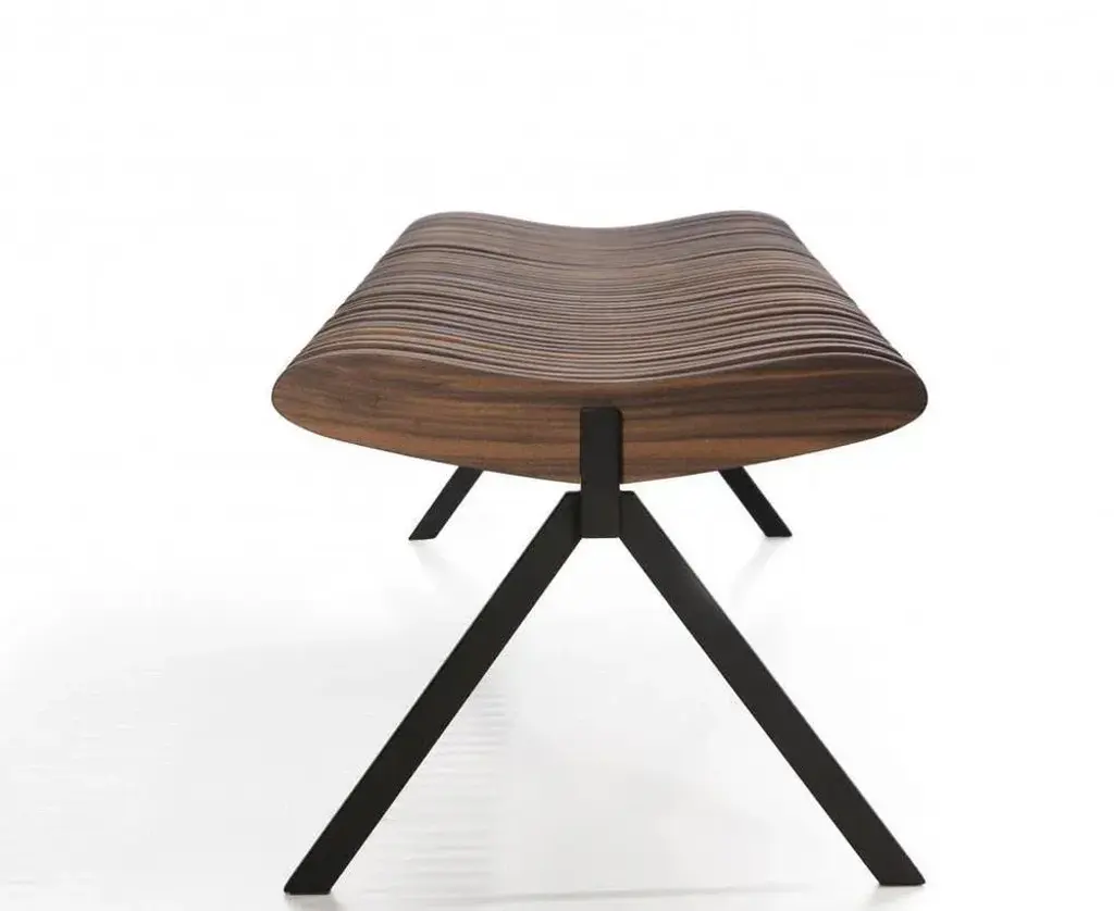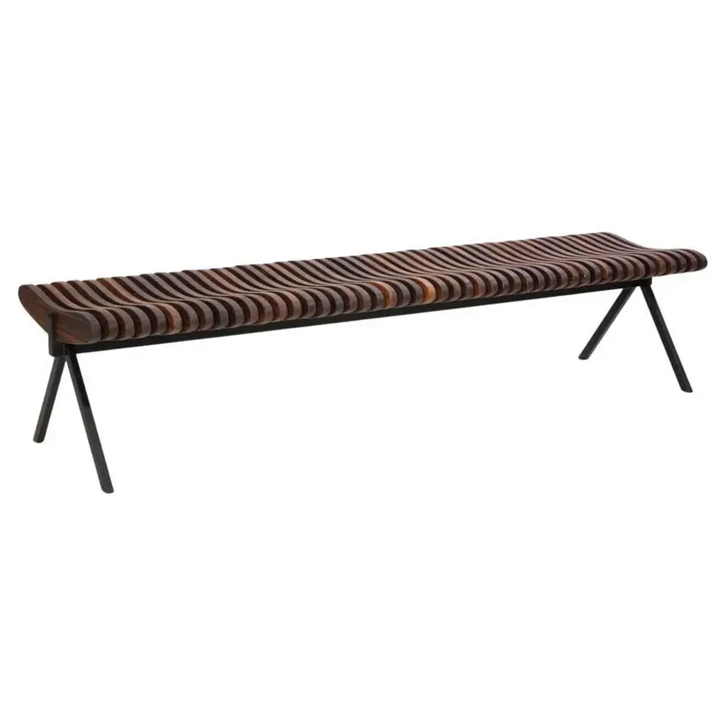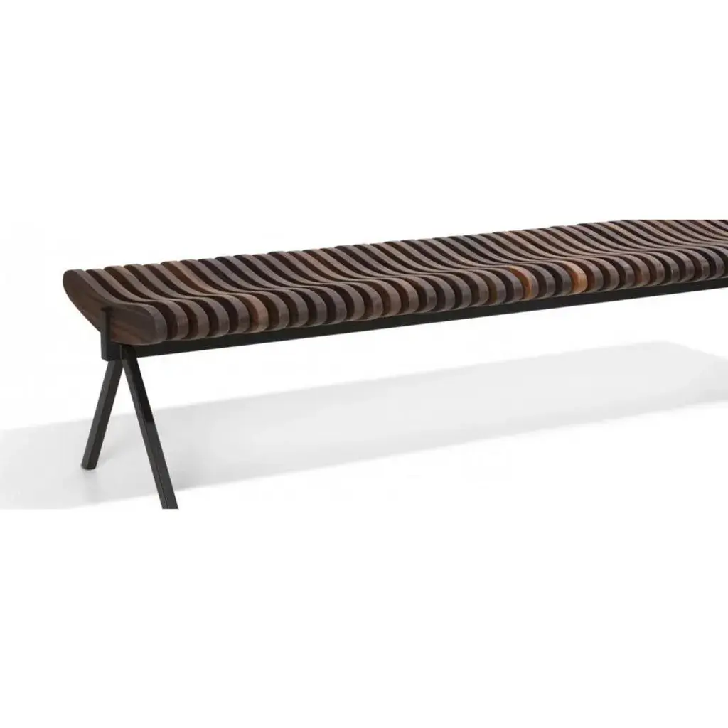 Perlude walnut natural large by caroline voet. Dimensions: 190 x h 43 cm materials: walnut natural may be available separately in oak natural, seating oak black, seating teak (outdoor). The prelude benches are assembled from top grade fsc-labelled wood, solid oak for indoor use, and teak for outdoor use, fixated to a minimal steel base frame lacquered black. By combining a sturdy metal base with the fluent and elegant lines of the repetitive wooden parts of the seating surface, the prelude bench creates a surprising visual effect while still keeping very comfortable. The prelude can be used as a free standing bench or as a seat to a table playing its role as resting point at home as well as in a commercial environment and the public space, by inviting in a subtle and elegant way to a conversation as a true prelude to a dialogue. Pu.
